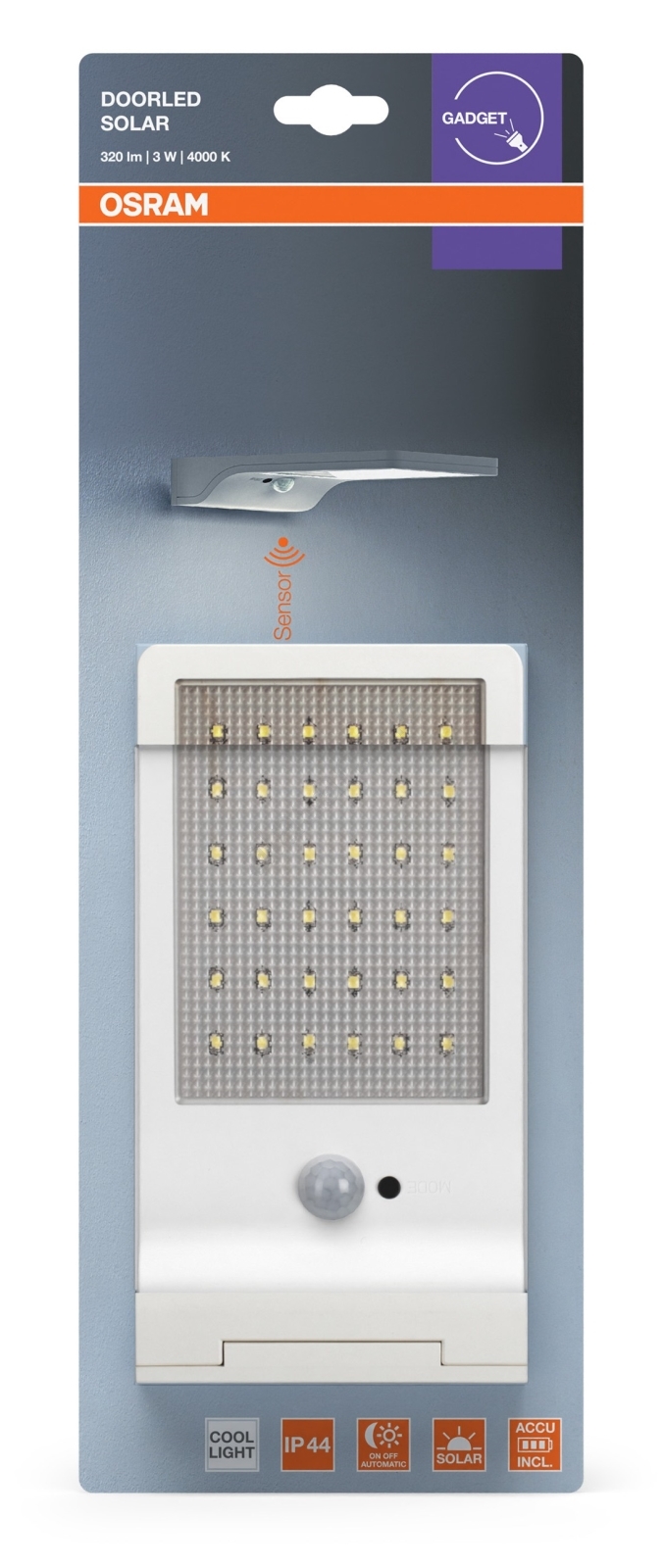 • Osram - DOORLED Solar LED Wall Light with Sensor, 3W LED / 3.3V, 2000 mAh, IP44, White