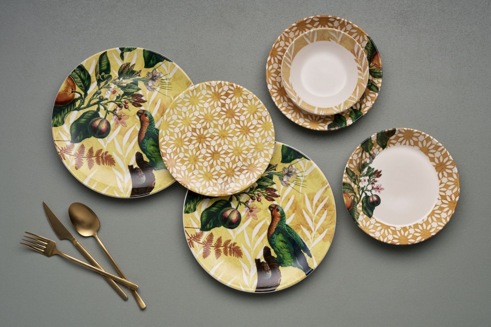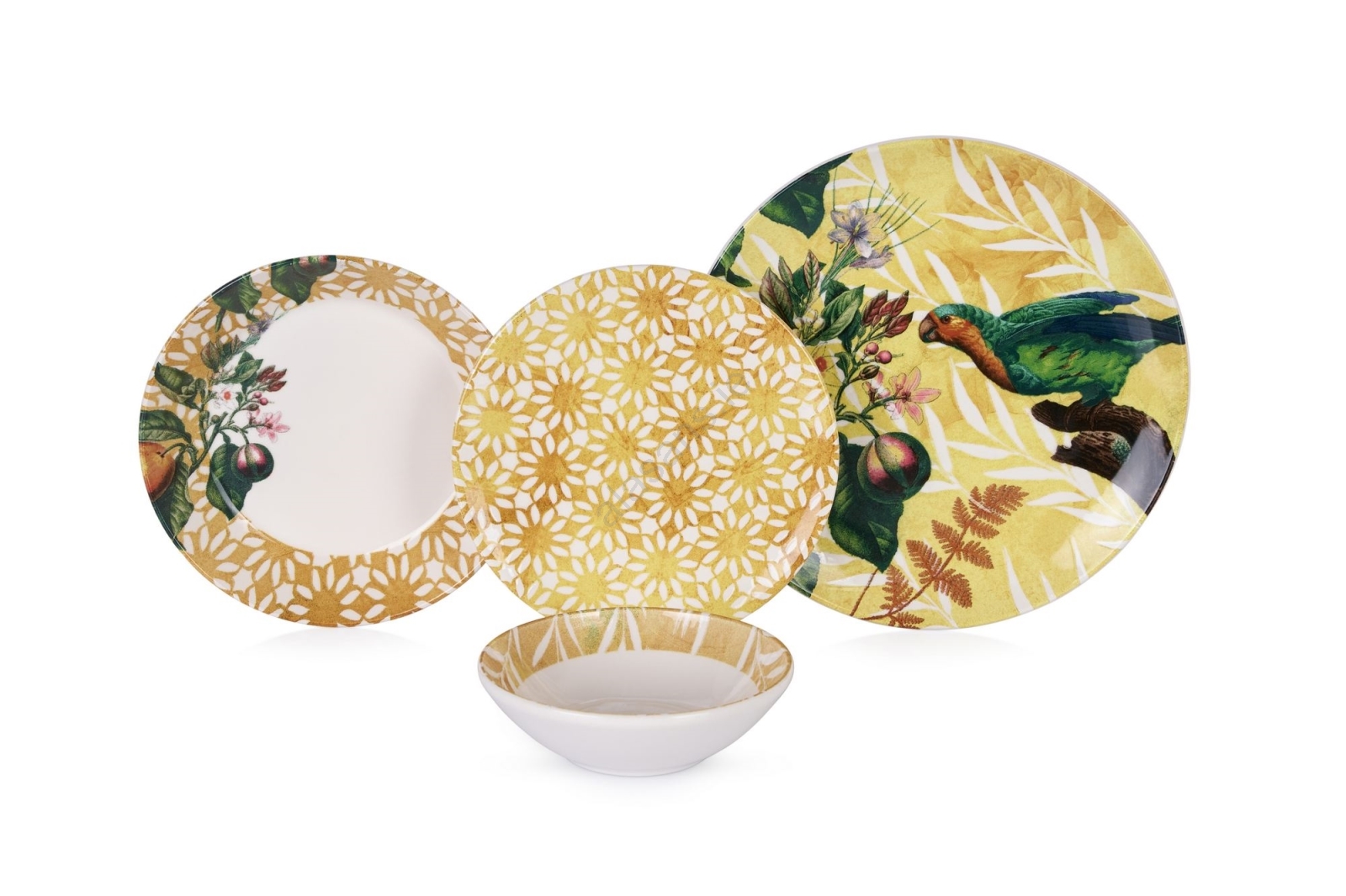 24-piece ceramic dinnerware set in yellow, green and white