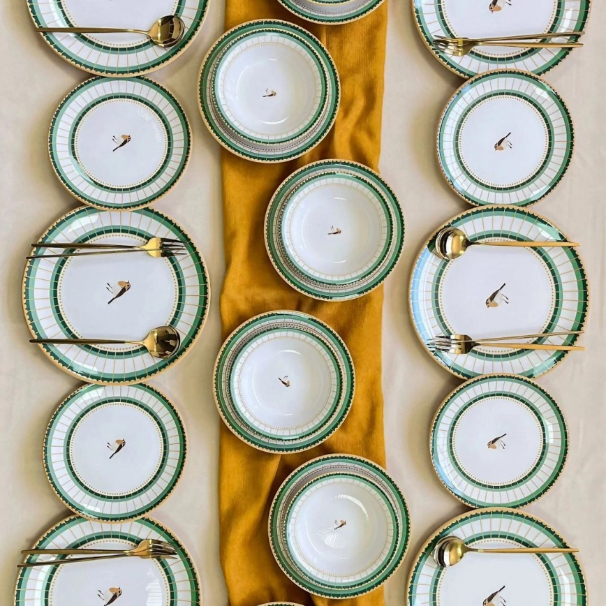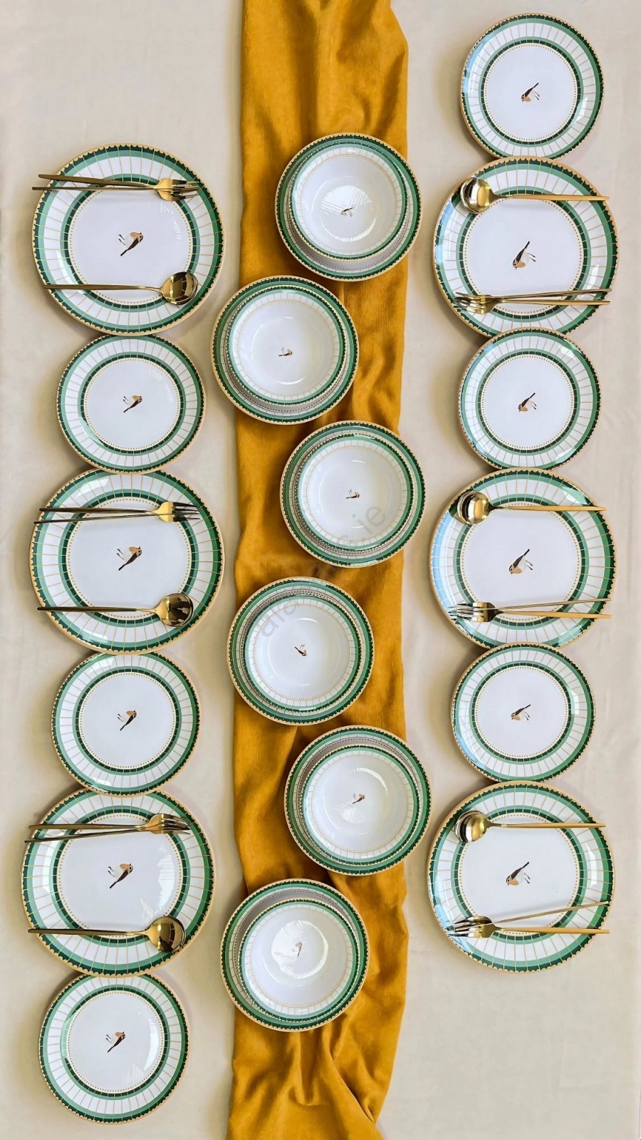 24-Piece Ceramic Dinnerware Set — White / Green / Gold