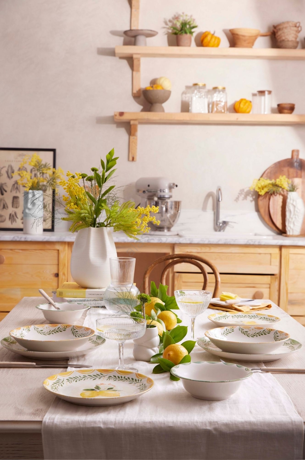 24-piece porcelain dinnerware set in yellow, white and green