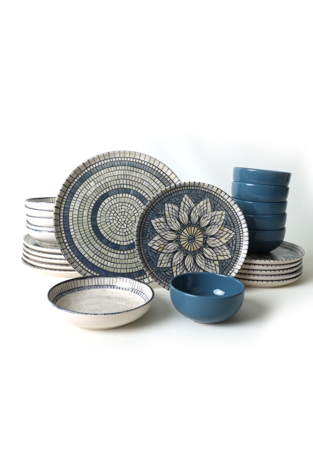 24-piece stoneware dinnerware set in blue and cream