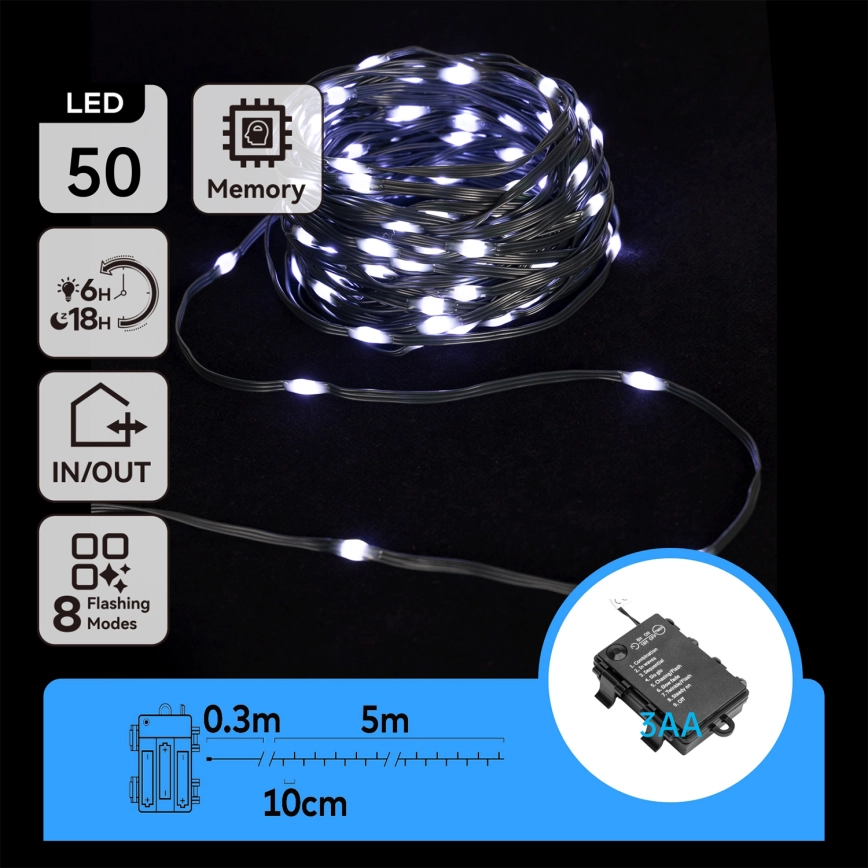 Aigostar - LED Outdoor String Lights, 50 LEDs / 8 Functions, 3×AA, 5.3 m, IP44, Cool White