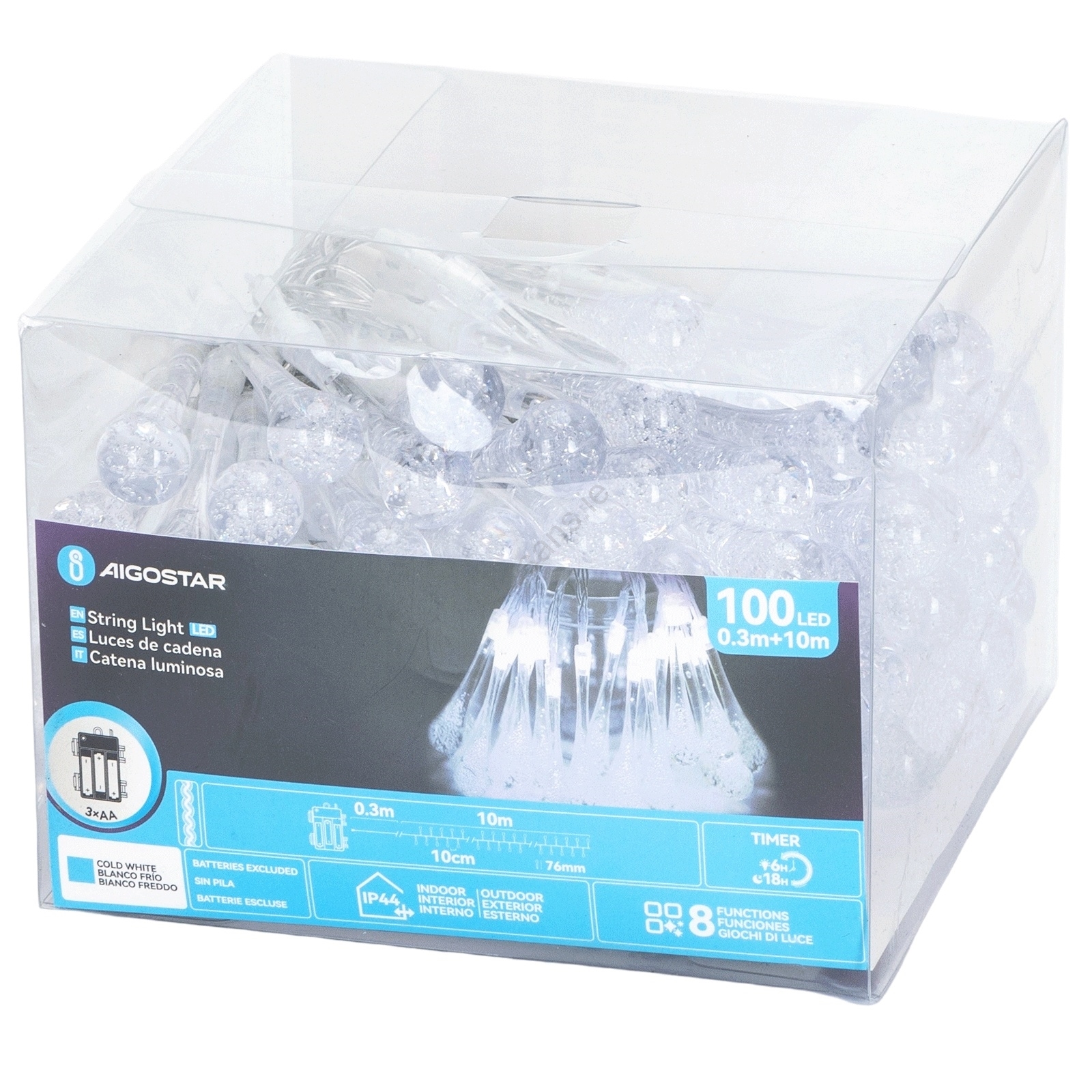 Aigostar - LED Outdoor Christmas String Lights, 100 LEDs / 8 Functions, 3xAA, 10 m, IP44, Cool White, Drop-shaped