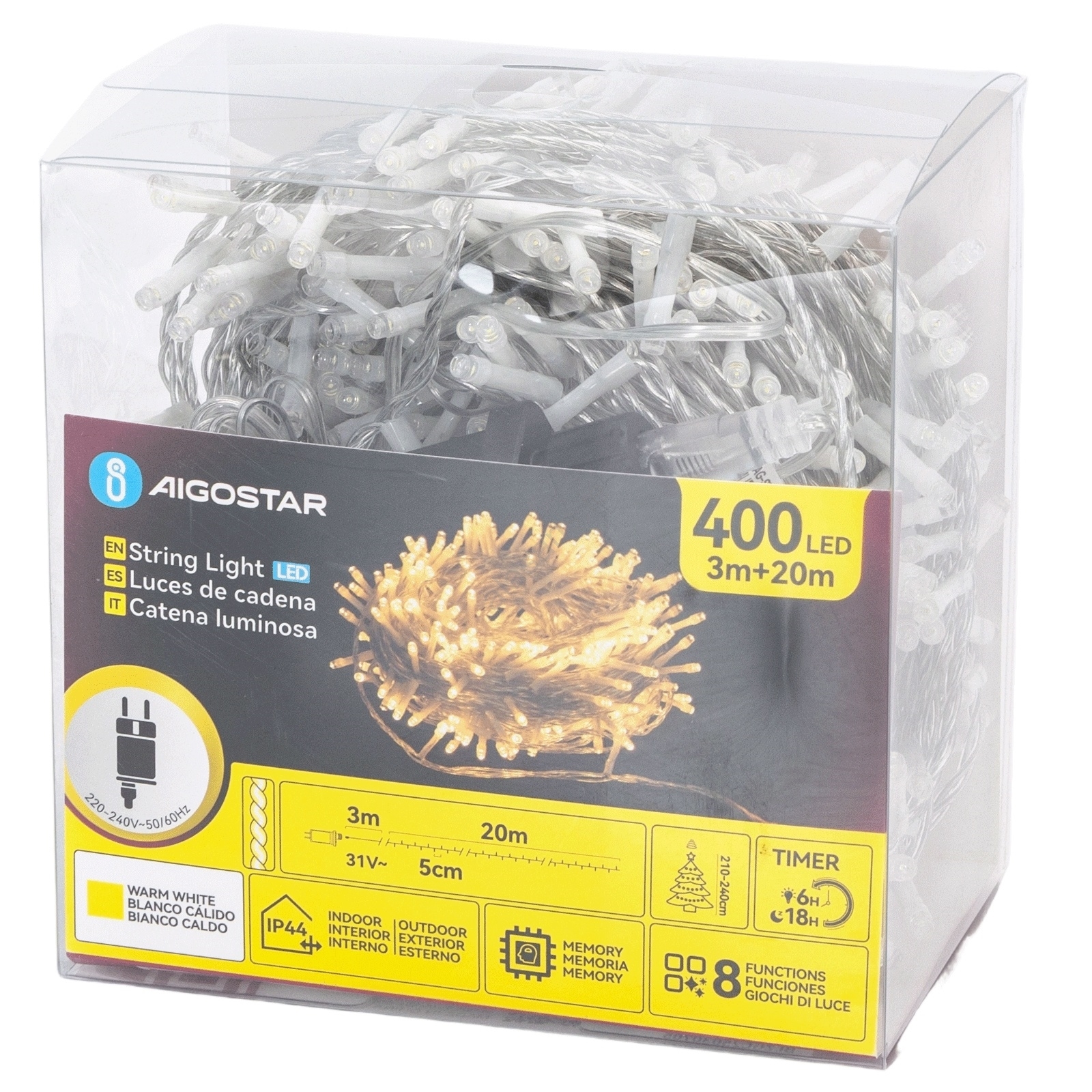 • Aigostar - LED Outdoor Christmas String Lights, 400 LEDs, 8 Modes, 20 m, IP44, Warm White