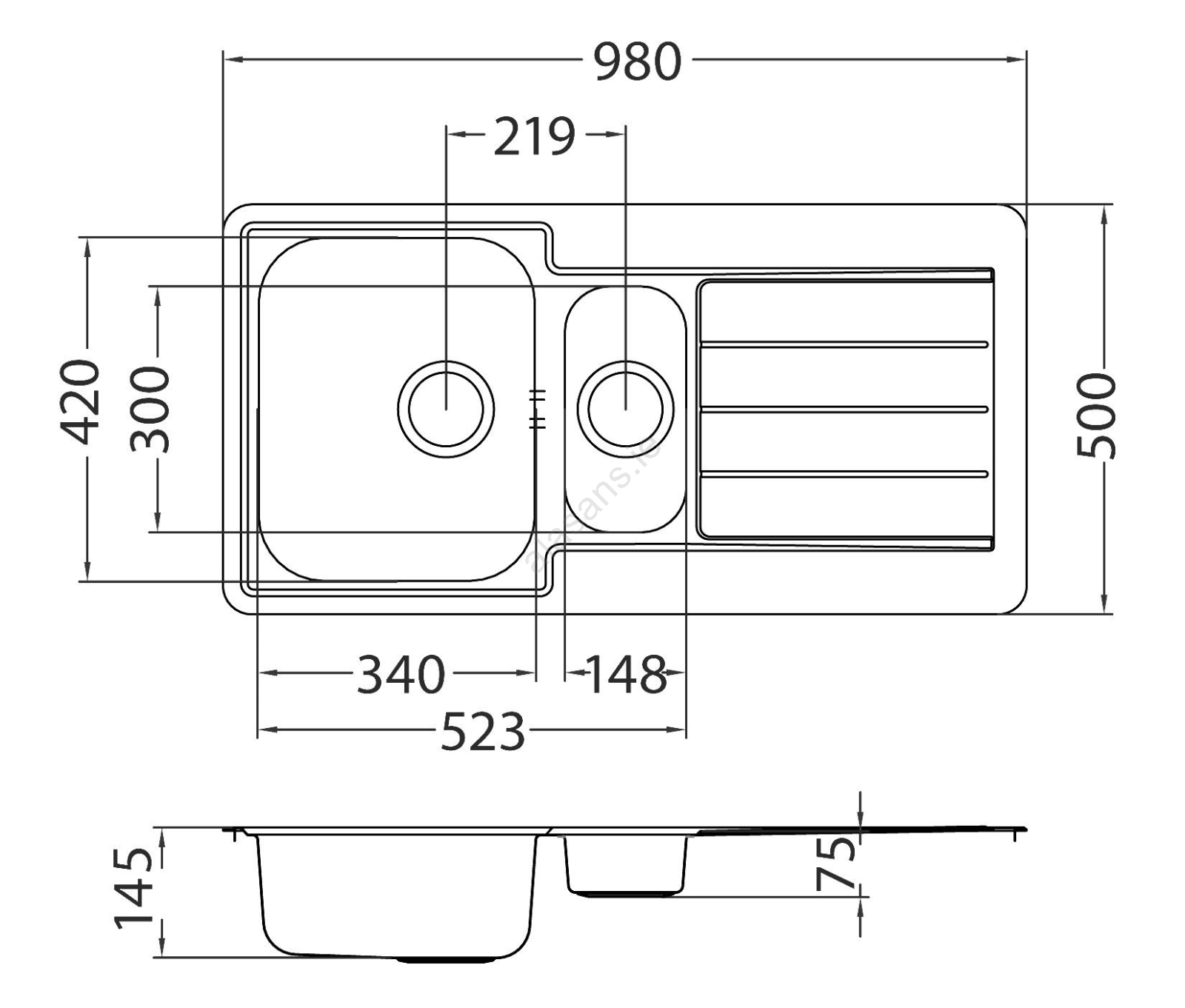 • Sink with one large and one smaller bowl.