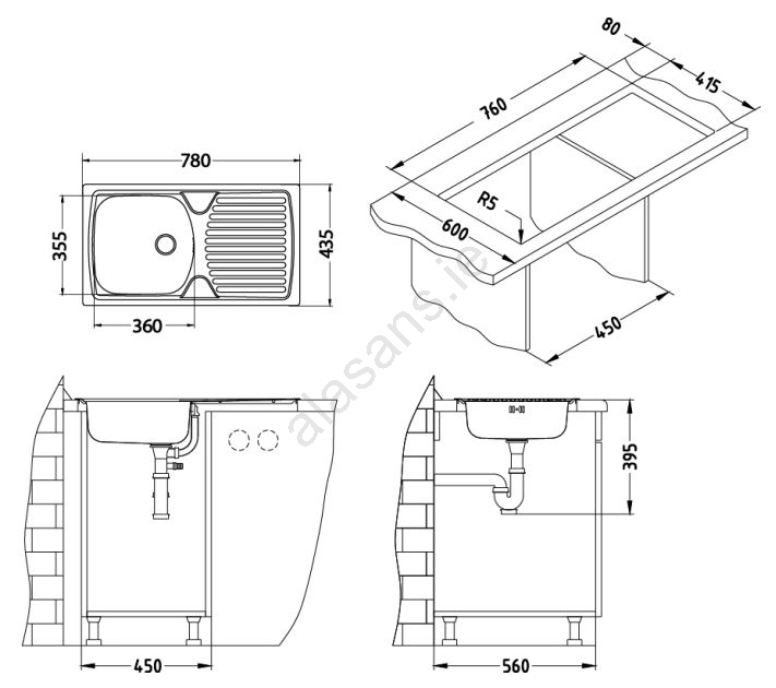 • Contents of package: stainless steel sink, mounting clips and seals, 1 1/2", trap with dishwasher outlet, plug, sink faucet, flexible connection hoses, installation kit.