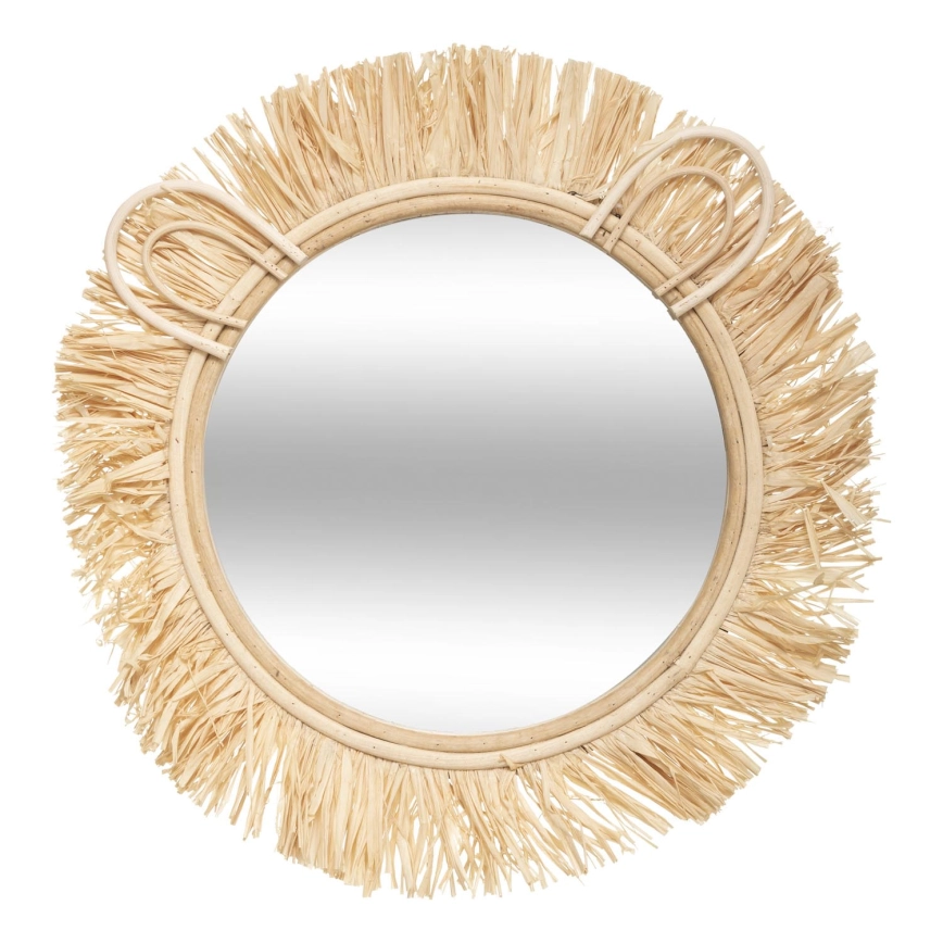 • The mirror's frame is crafted from rattan and raffia.
