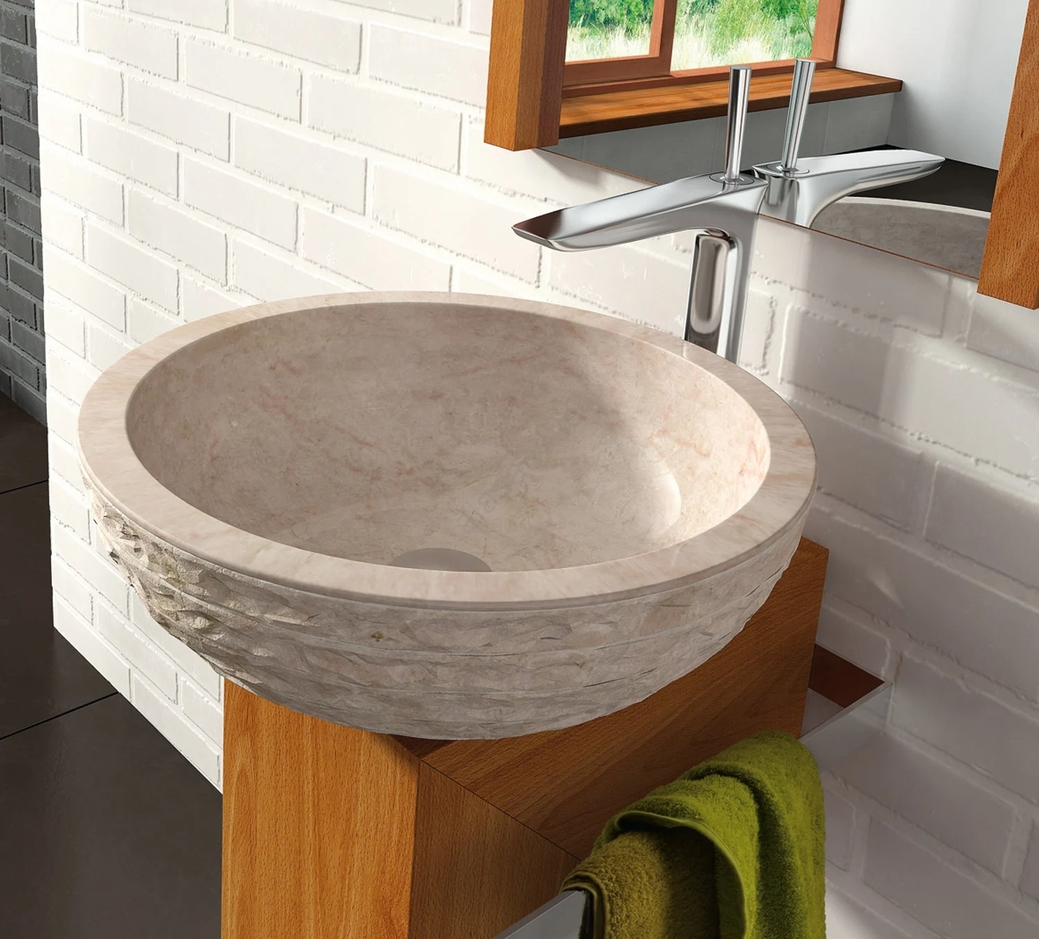 • The washbasin is crafted from natural stone.