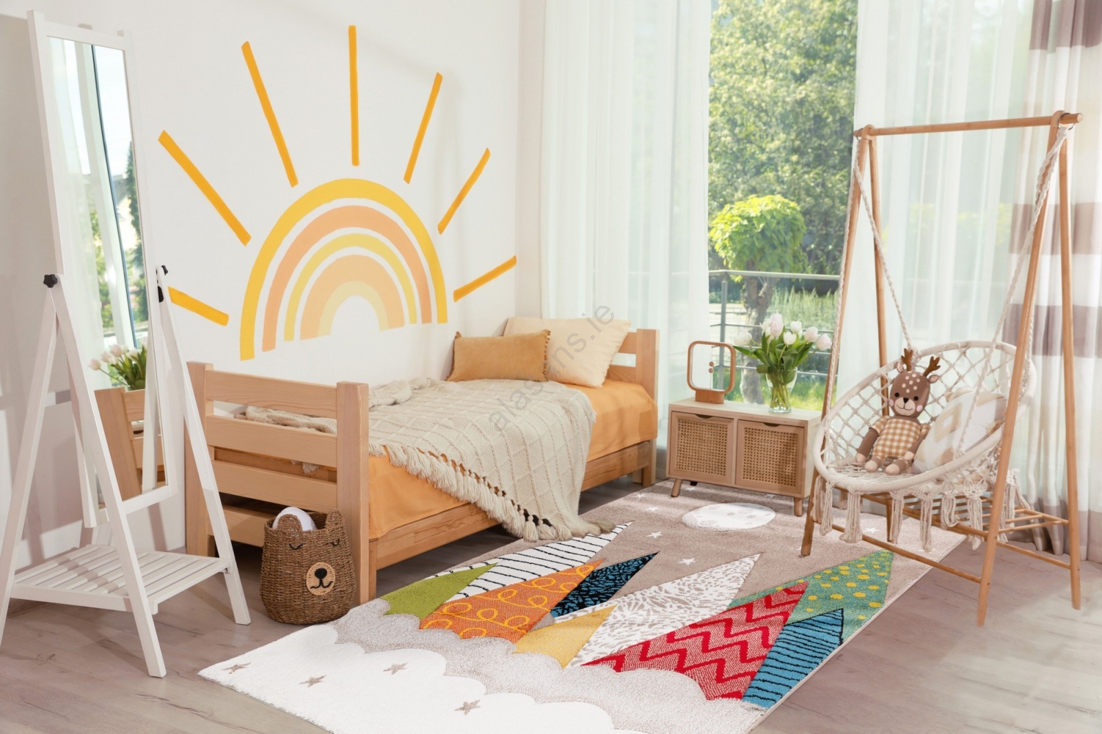 • Colorful children's rug with a mountain motif.