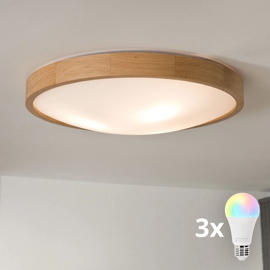 Brilagi - LED RGBW Dimmable Ceiling Light CARVALHO SLIM 3xE27/15W/230V 2700–6500K Wi‑Fi, Oak, Ø 47 cm
