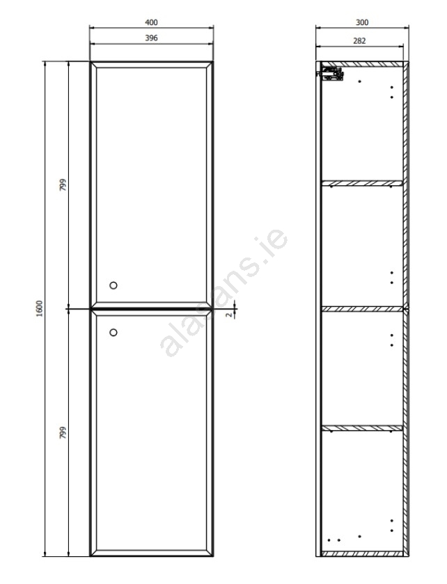 • The front panel, carcass and three internal shelves are made of 16mm particleboard with a matte white lacquer finish.