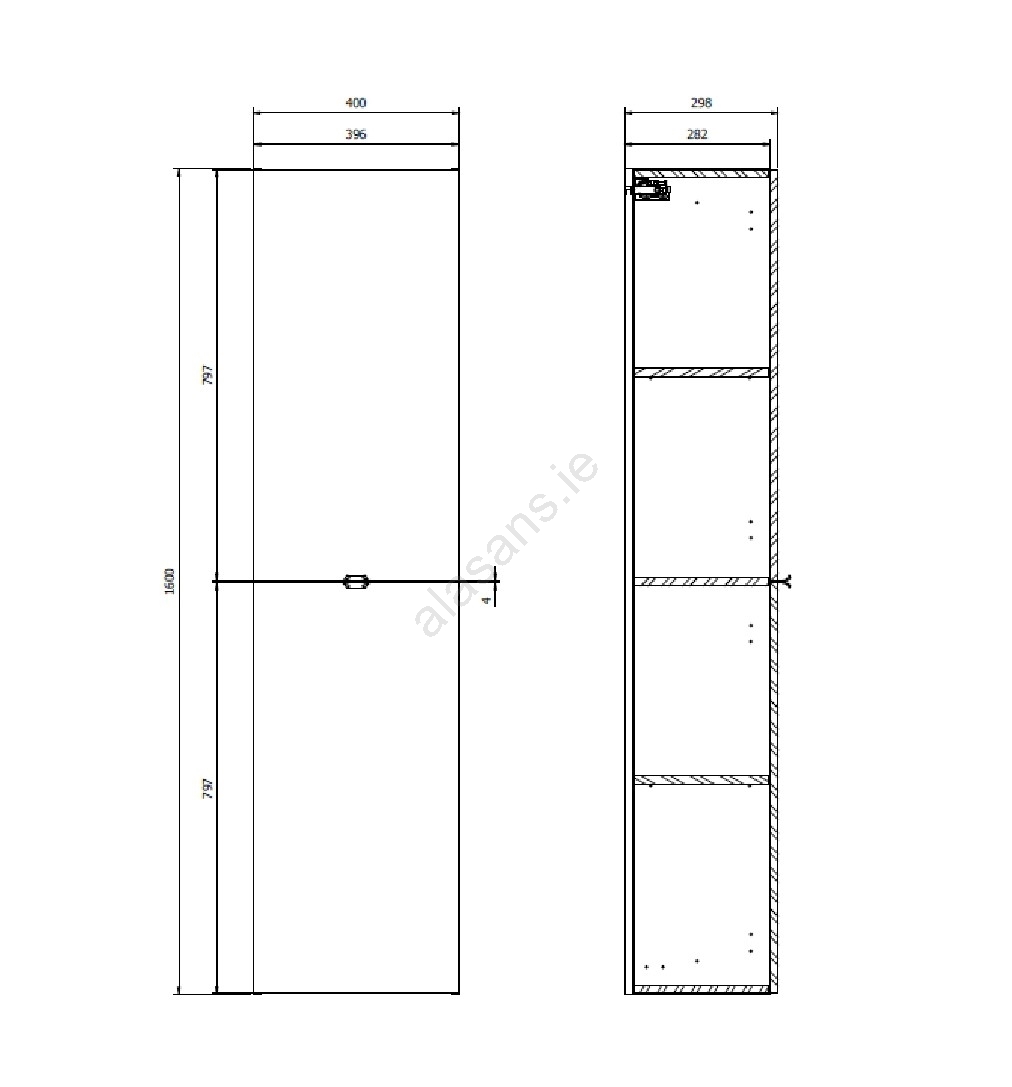 • The front panel, carcass and internal shelves are made from 16 mm particleboard with a white lacquer finish.