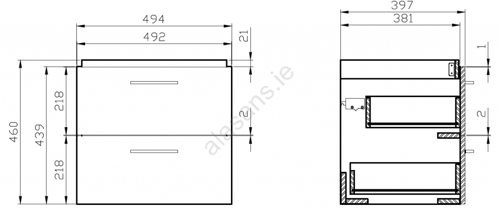 The cabinet has two spacious drawers with damped opening and chrome handles.