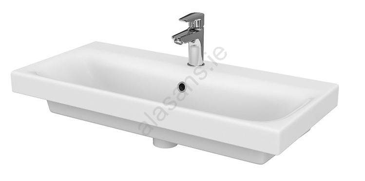 • The ceramic basin has a classic rectangular shape with a tap hole and overflow.