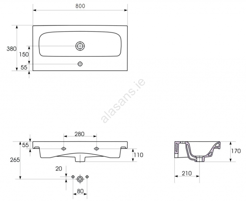 • The ceramic basin has a classic rectangular shape with a tap hole and overflow.