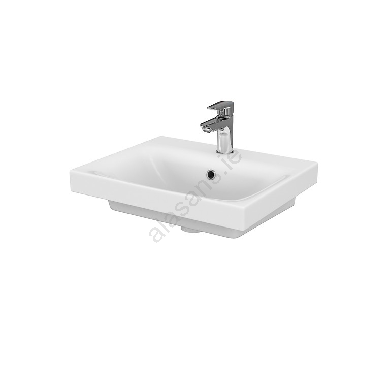 • The ceramic basin has a classic rectangular shape with a tap hole and overflow.