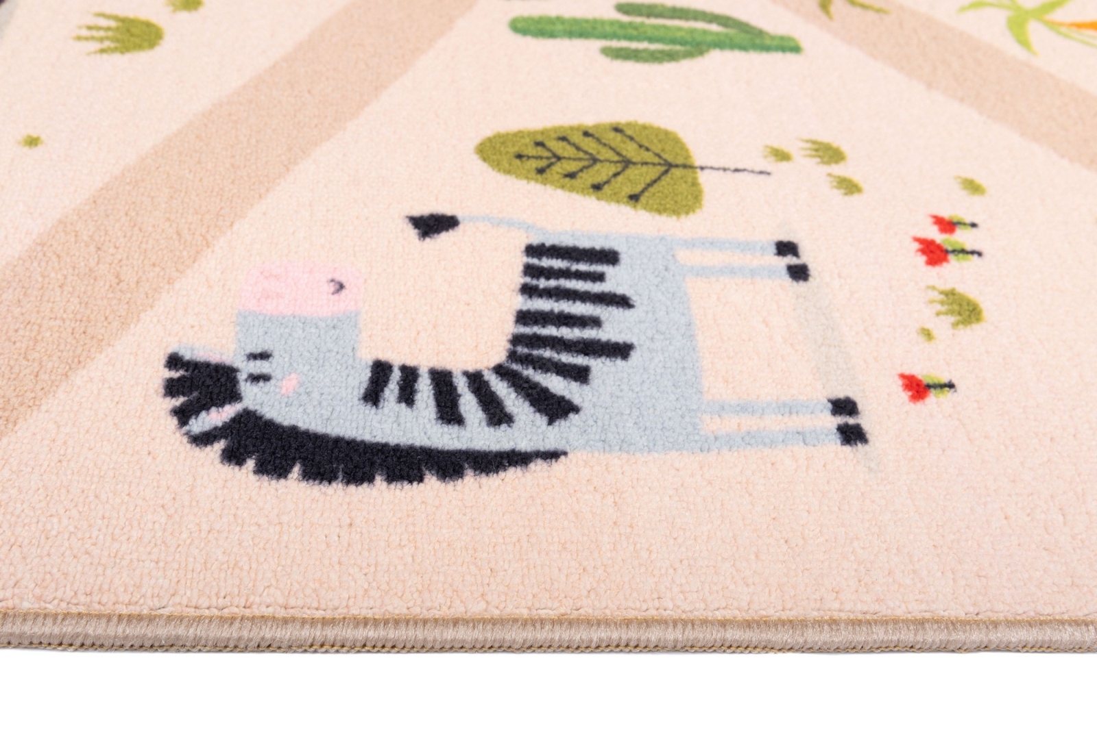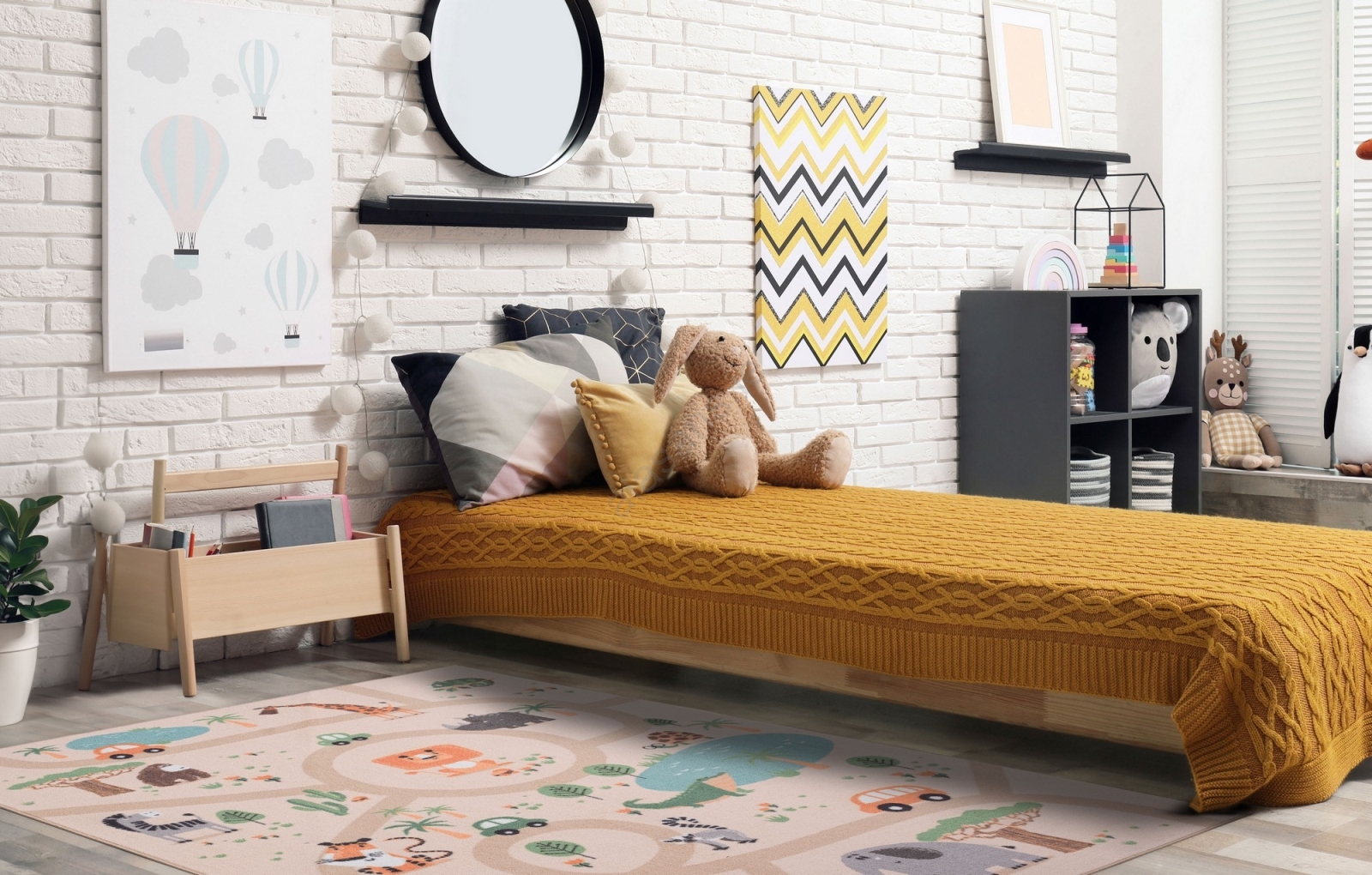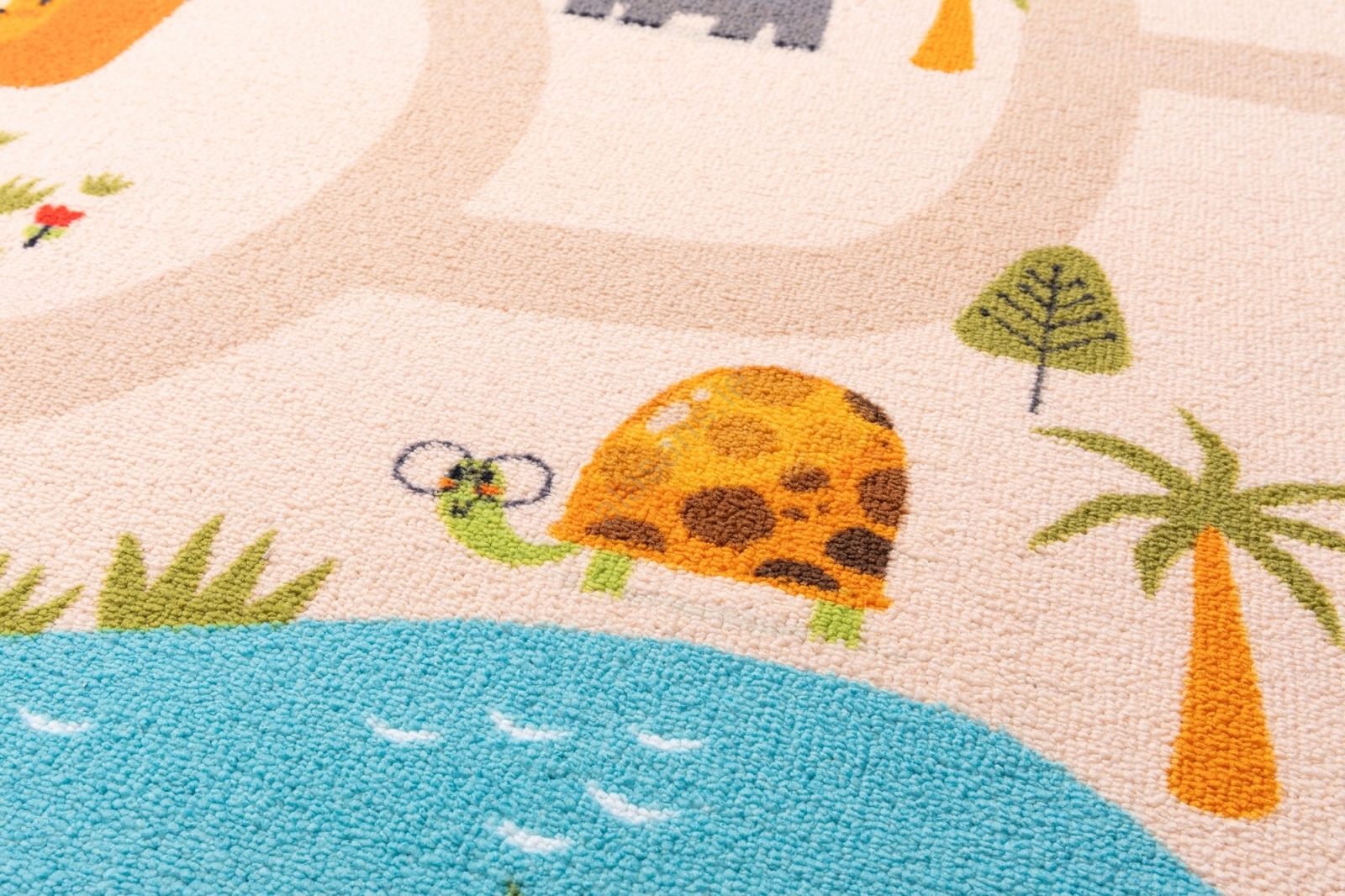 • Colorful children's rug with a safari pattern.