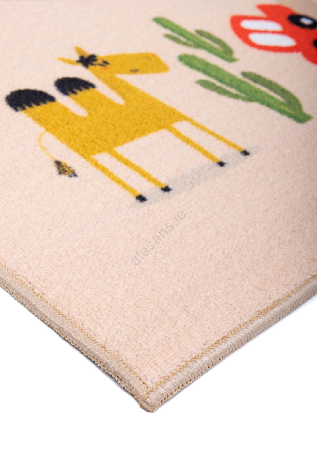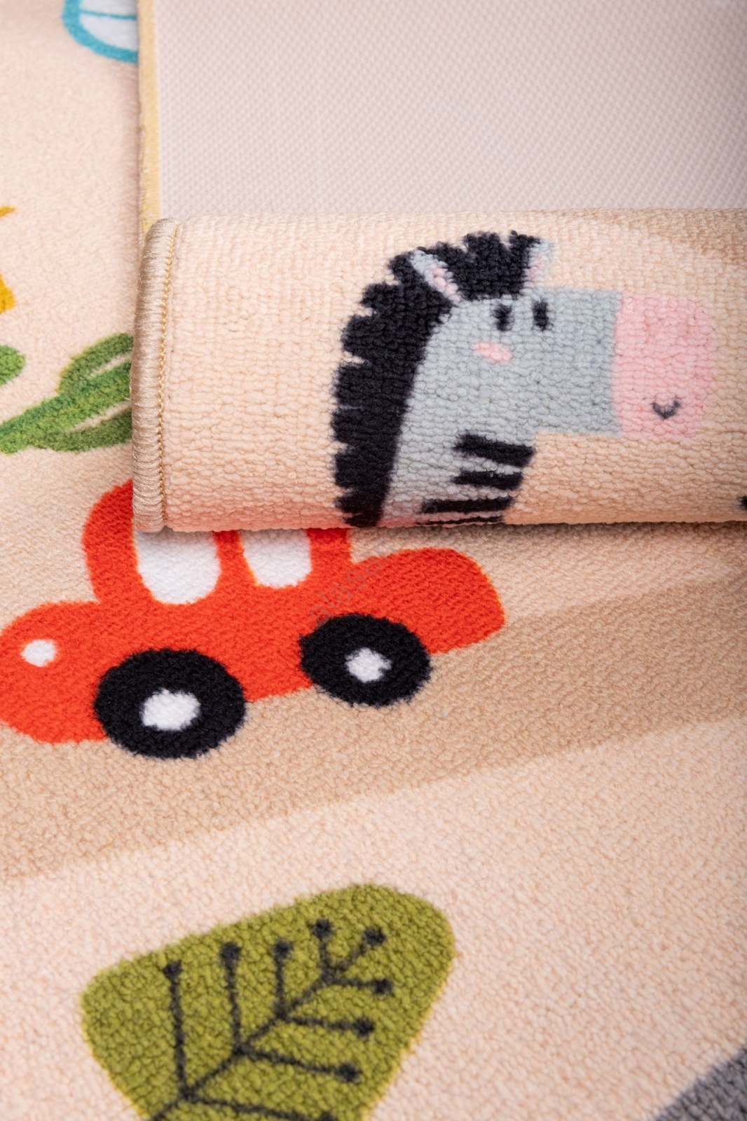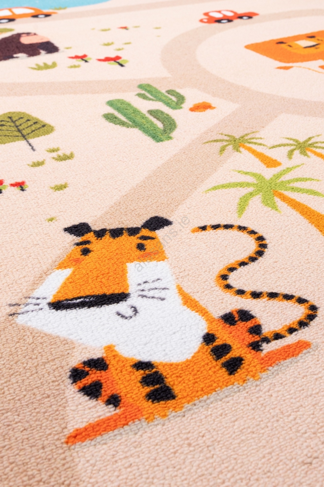 • Colorful children's rug with a safari pattern.