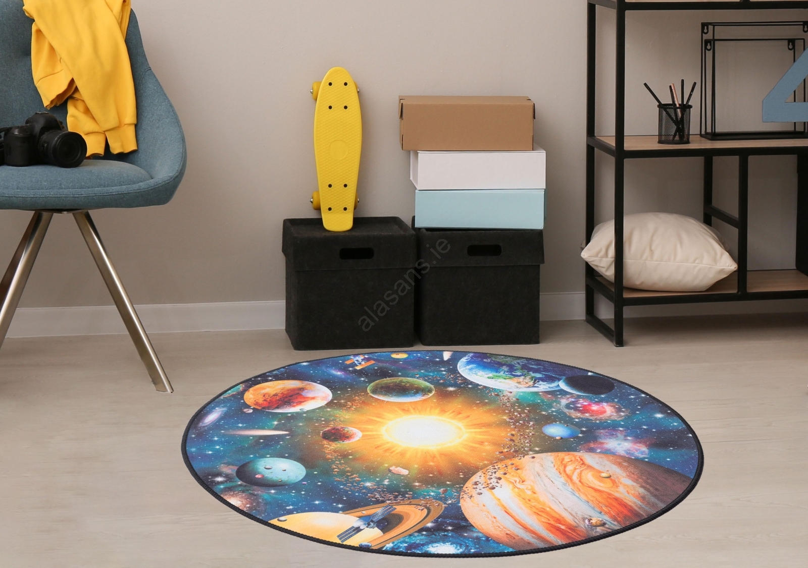 • Colorful children's rug with a planet pattern.