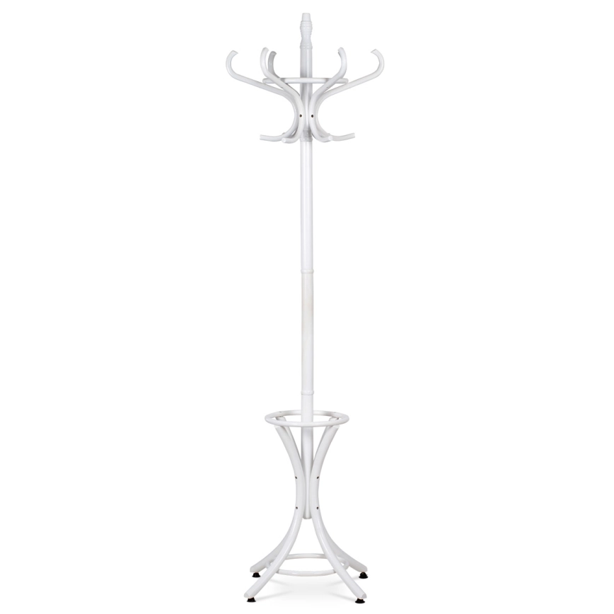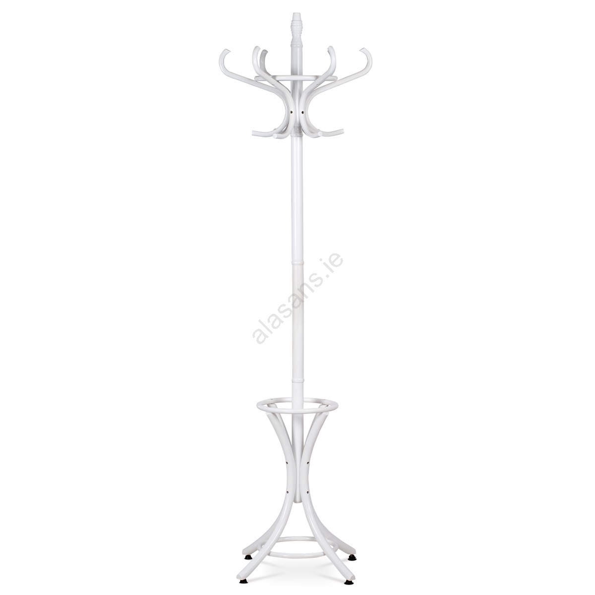 • Solid wood freestanding coat rack in white lacquer combines robust construction with timeless design.
