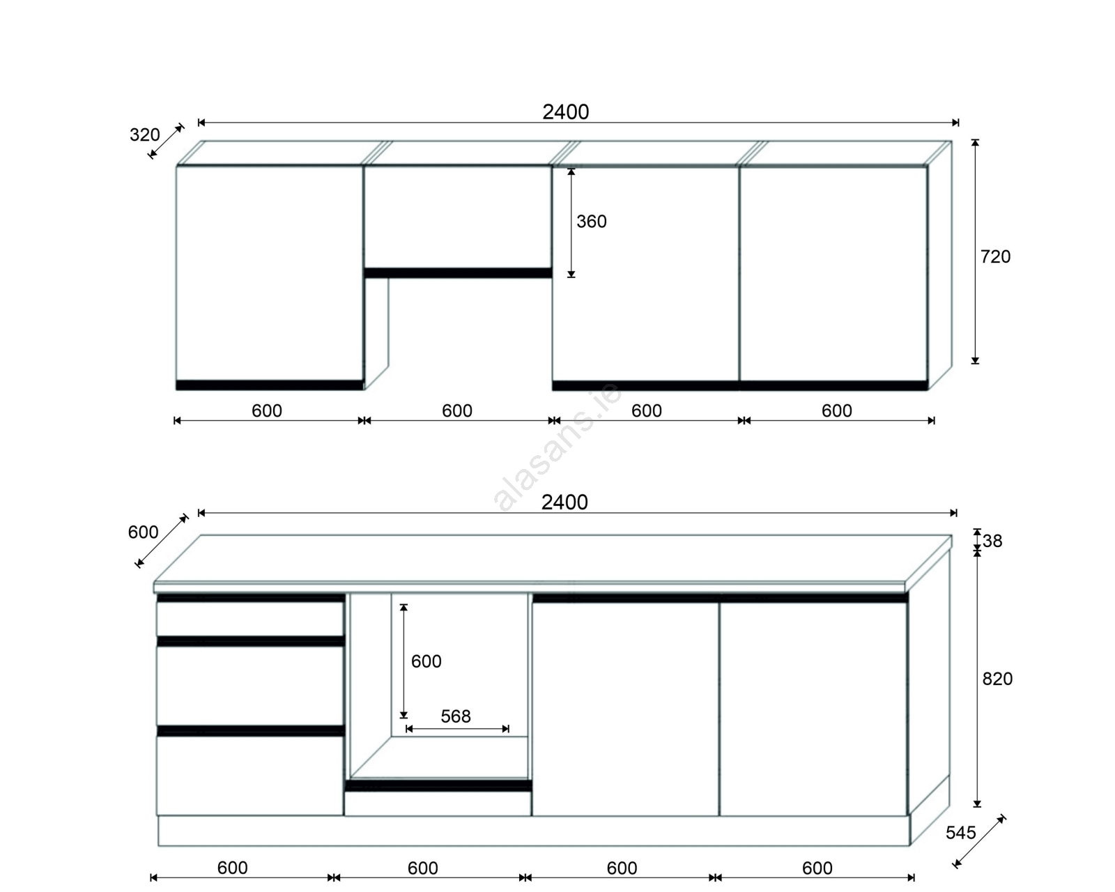 • Upper cabinets are fitted with gas struts, in the drawers are built-in high-quality encased metal slides.