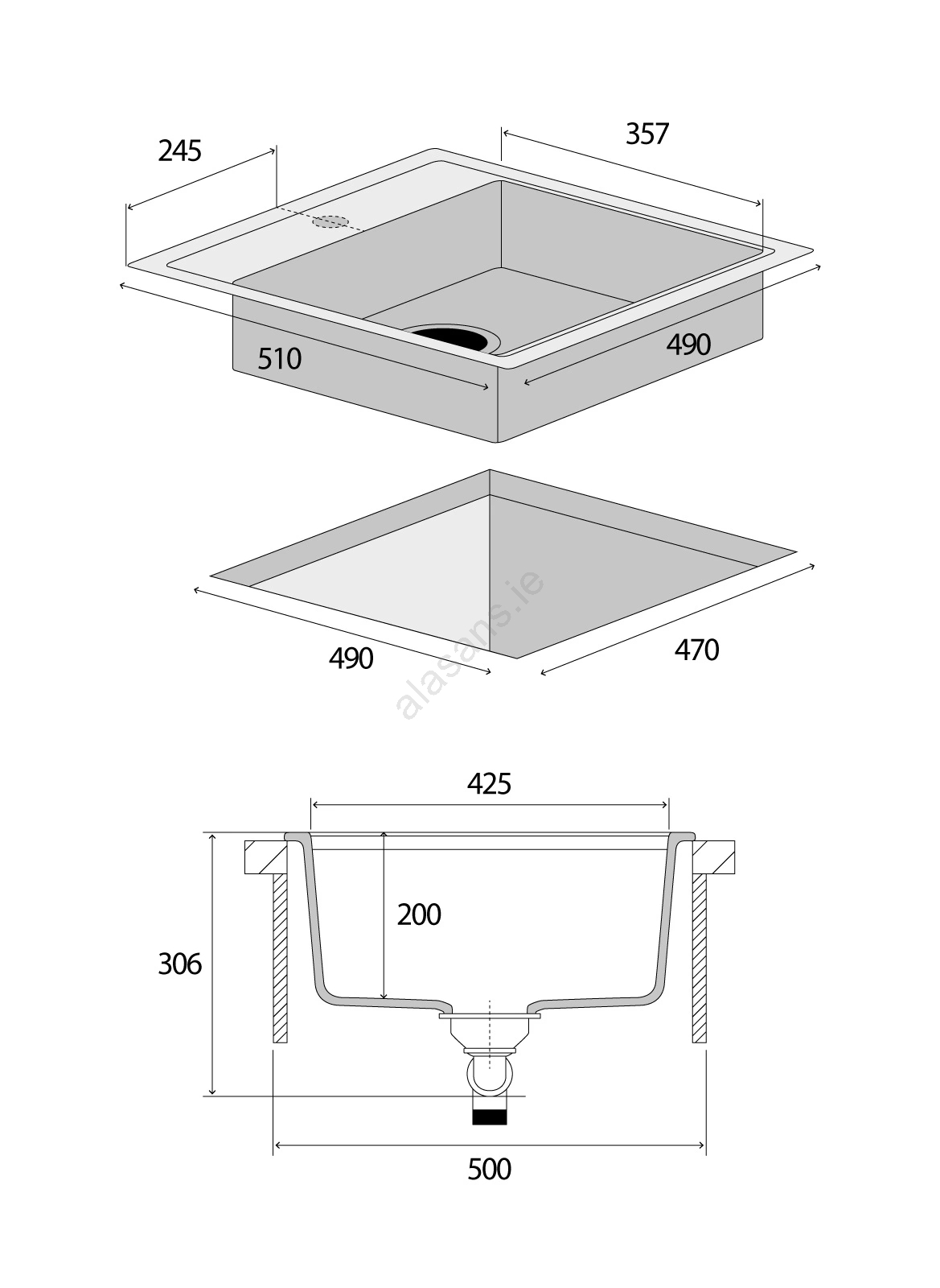 • Bowl dimensions (L x W x D): 357 x 425 x 200 mm.