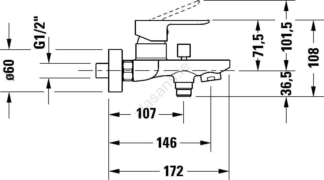 • Wall-mounted single-lever bath mixer designed for wall installation.