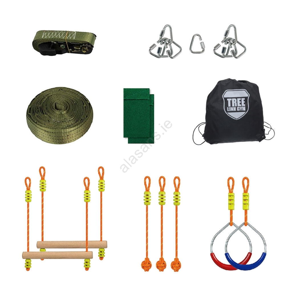 • Included in the package: bag, belt with 9 handles and 9 carabiners for attaching obstacles, 1 clamping belt with a ratchet, 2 tree protectors, 2 obstacle trapezes, 2 obstacle rings, and 3 obstacle rope handles.