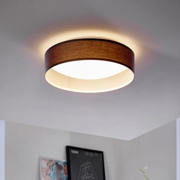 • The appearance of the surface-mounted LED light is accentuated by a lampshade made of gray-brown fabric.