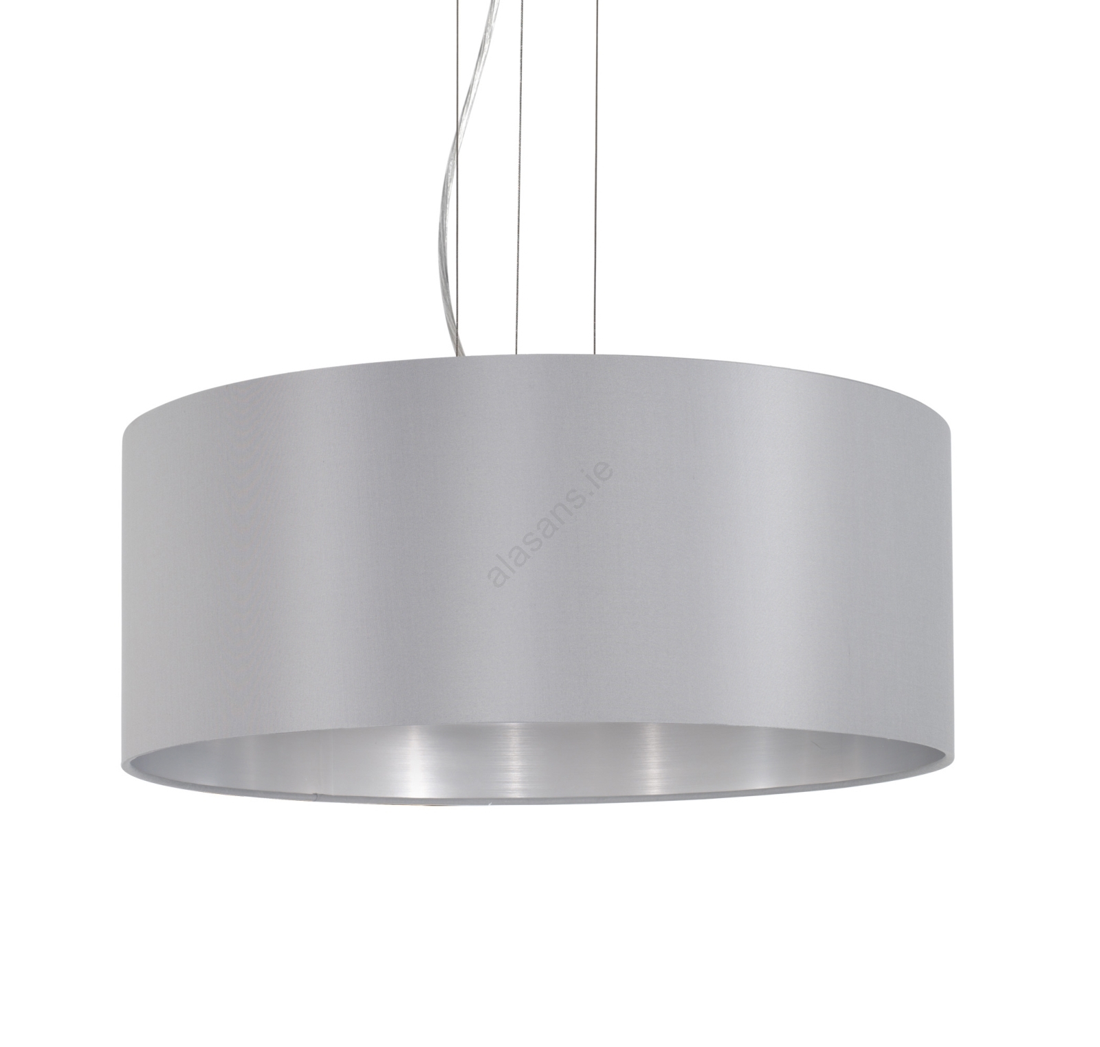 • The appearance of the light fixture is accentuated by a lampshade made of fabric with an outer gray color and an inner silver, complemented by a metal suspension.
