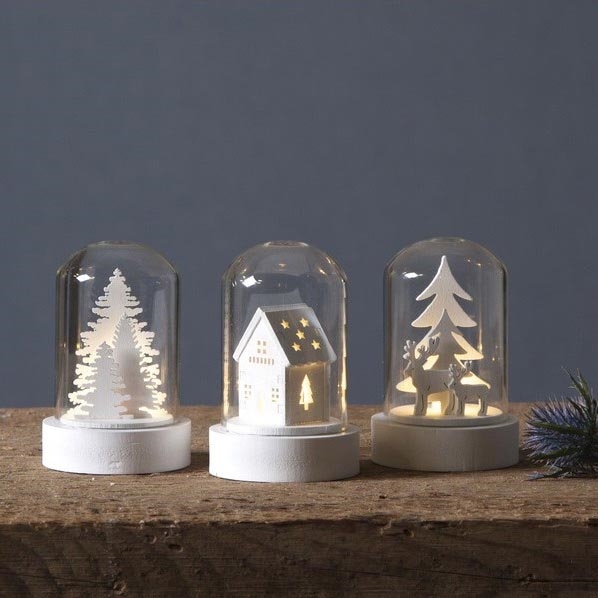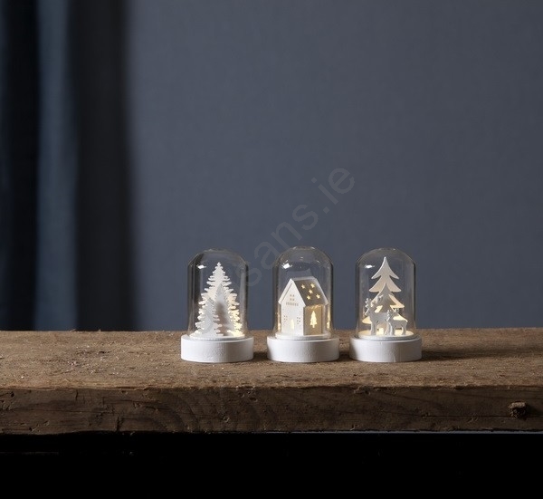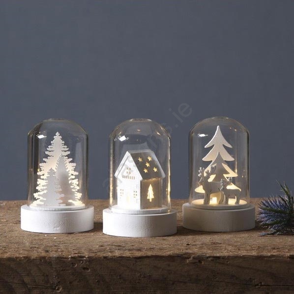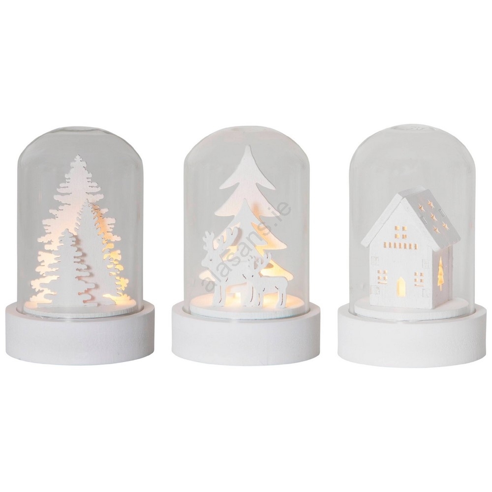 • Set of LED Christmas decorations with wooden figures inside.