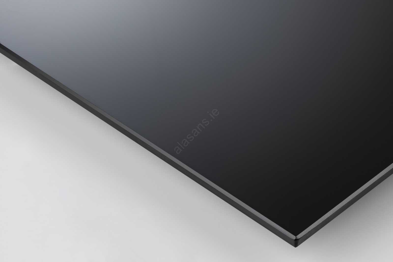 • The tabletop combines black tempered glass with particleboard in an oak finish.