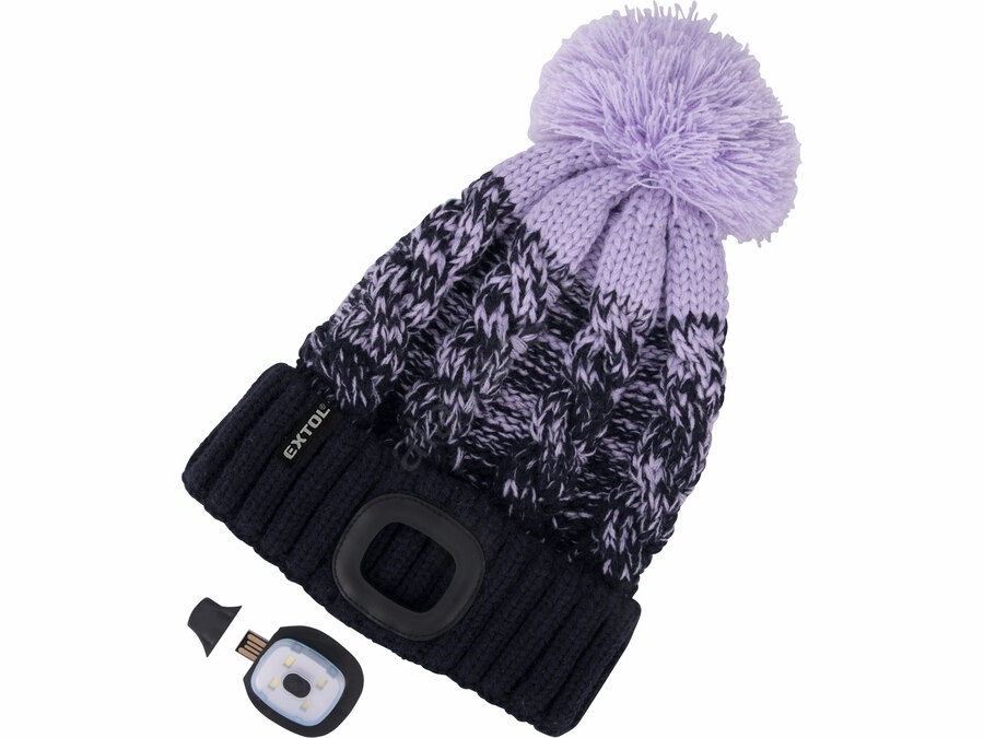 Extol - Beanie with integrated headlamp and USB-rechargeable 300 mAh battery, blue/purple with pom-pom, one size
