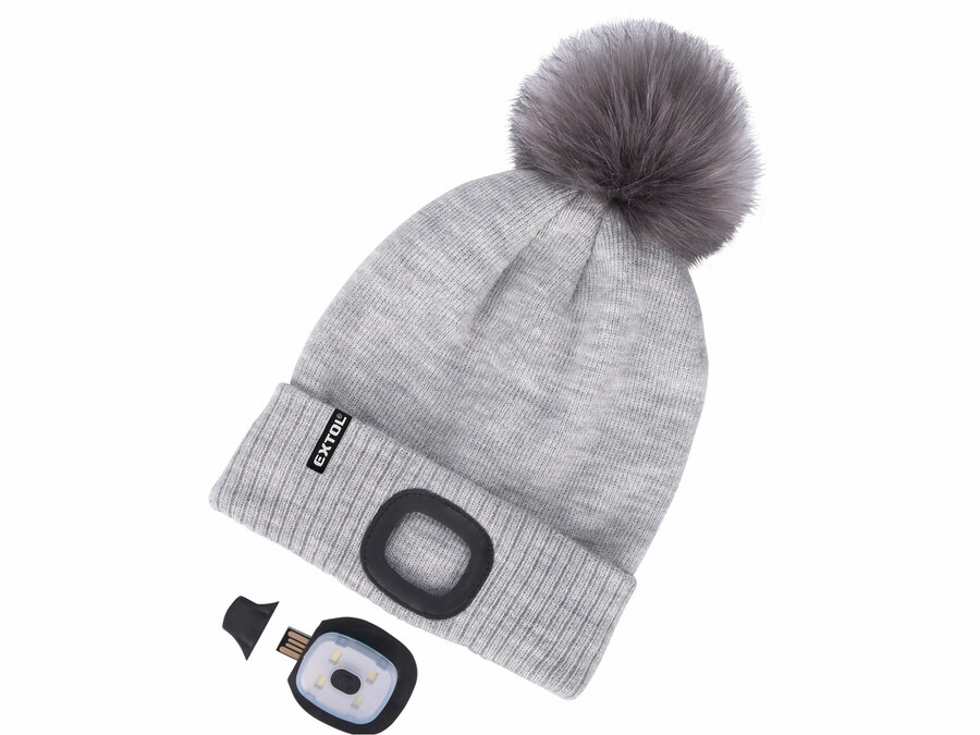 Extol - Beanie with USB-Rechargeable Headlamp, 300 mAh, Gray with Pom-Pom, One Size (UNI)