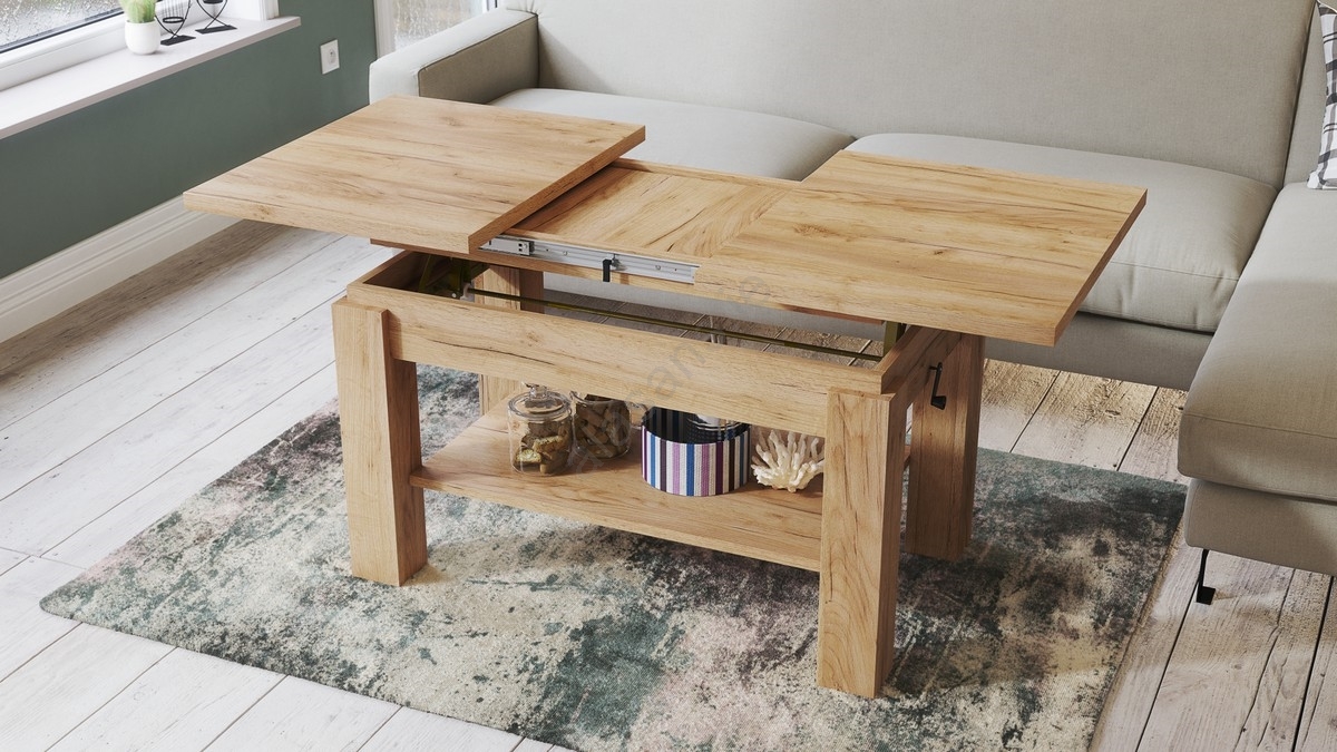 • ADONIS Extendable Coffee-to-Dining Table with Shelf, Craft Oak
