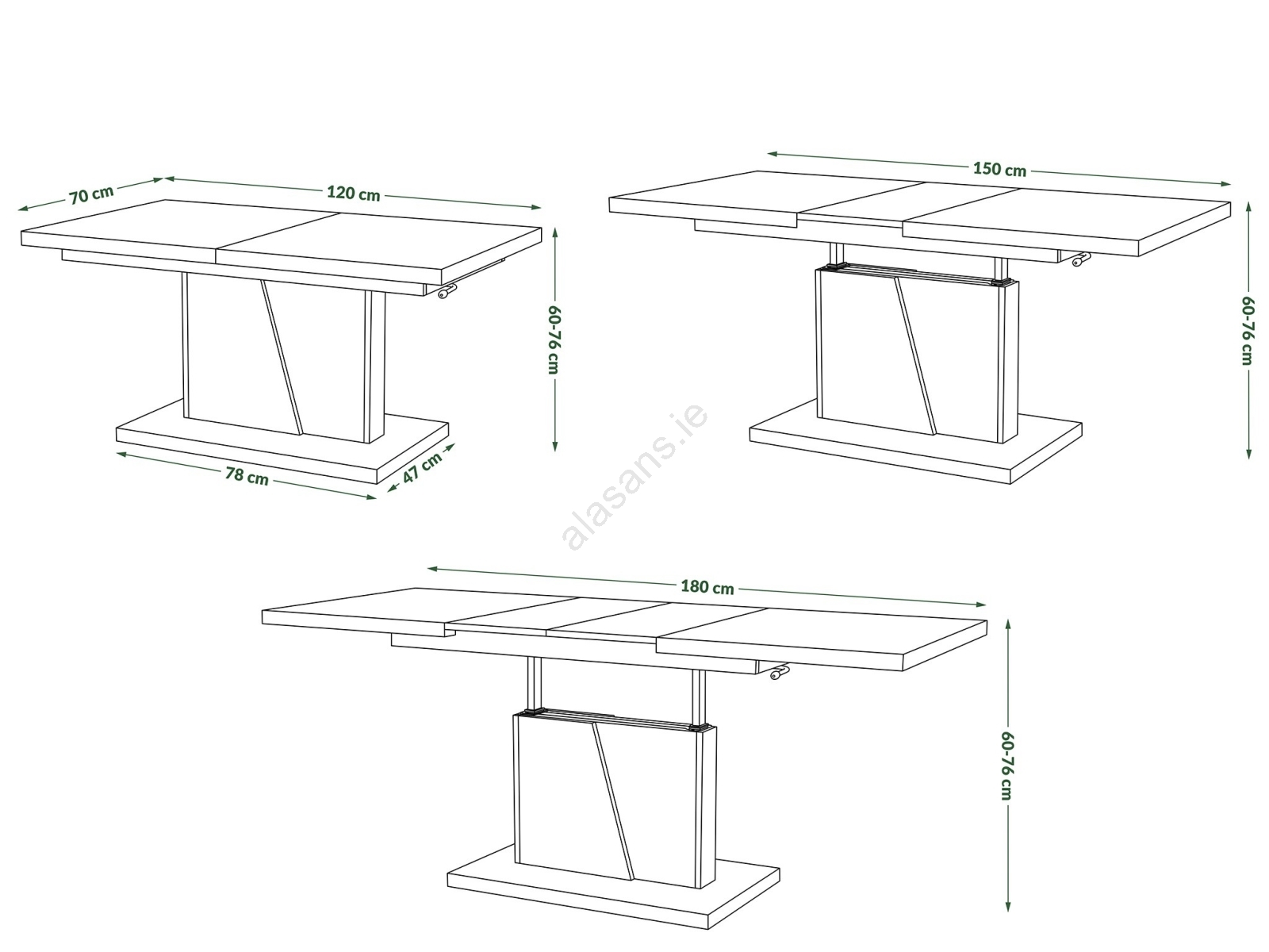 • Thanks to two 30 cm inserts, the tabletop can be extended to 150 or 180 cm.