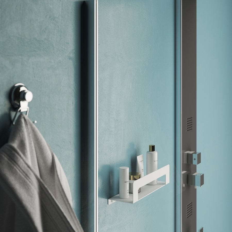 • Wall-mounted shelf with integrated towel holder.