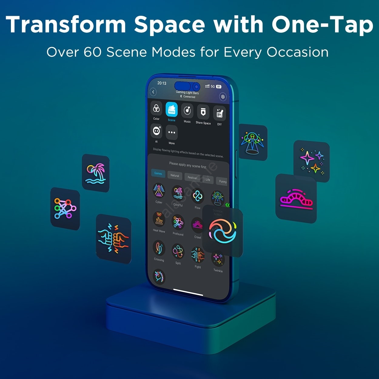 • Music mode – lights react to rhythm and sound, bringing every game and movie to life.