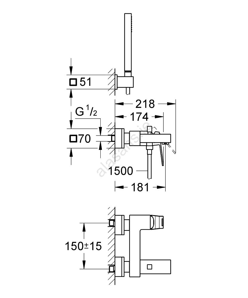 • Includes hand shower (27 698), wall-mounted shower holder (27 693) and 1500 mm shower hose (28 151 000).