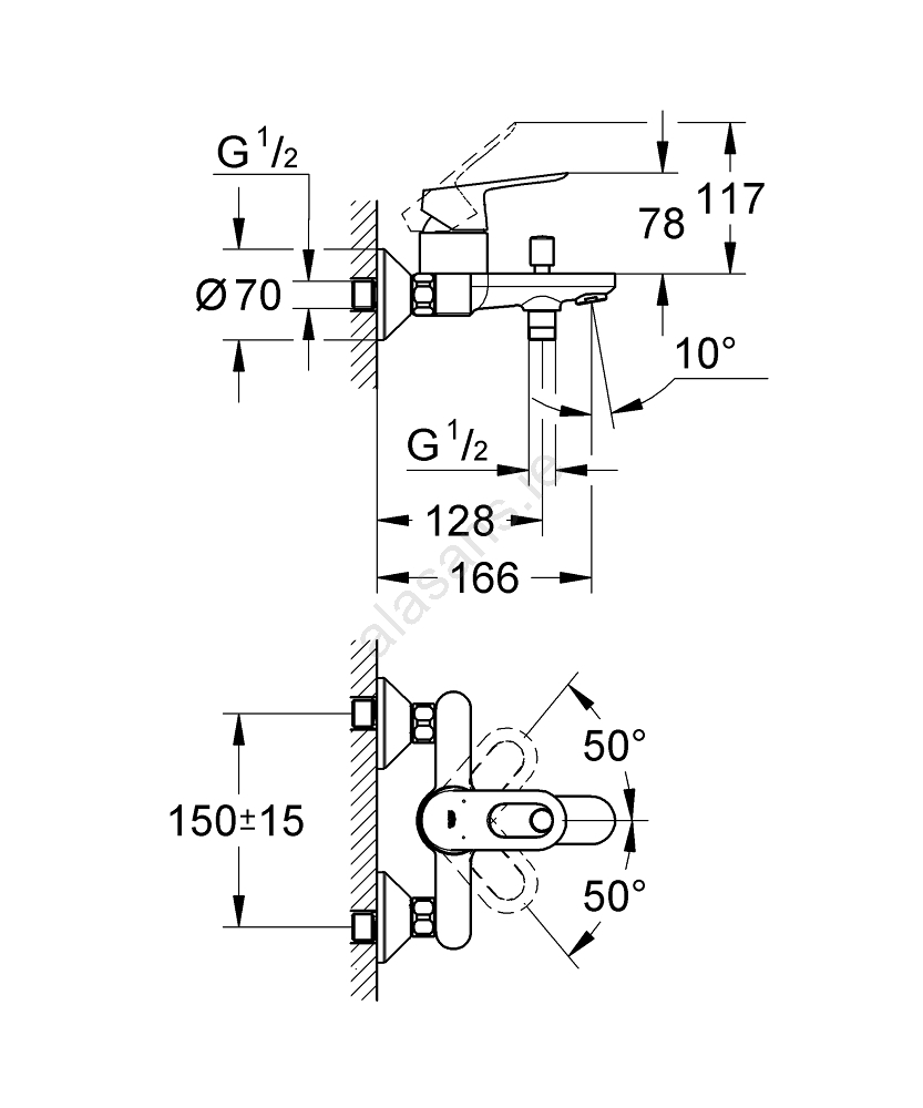 • Wall-mounted single-lever bath mixer with a modern Bauhaus-inspired design.