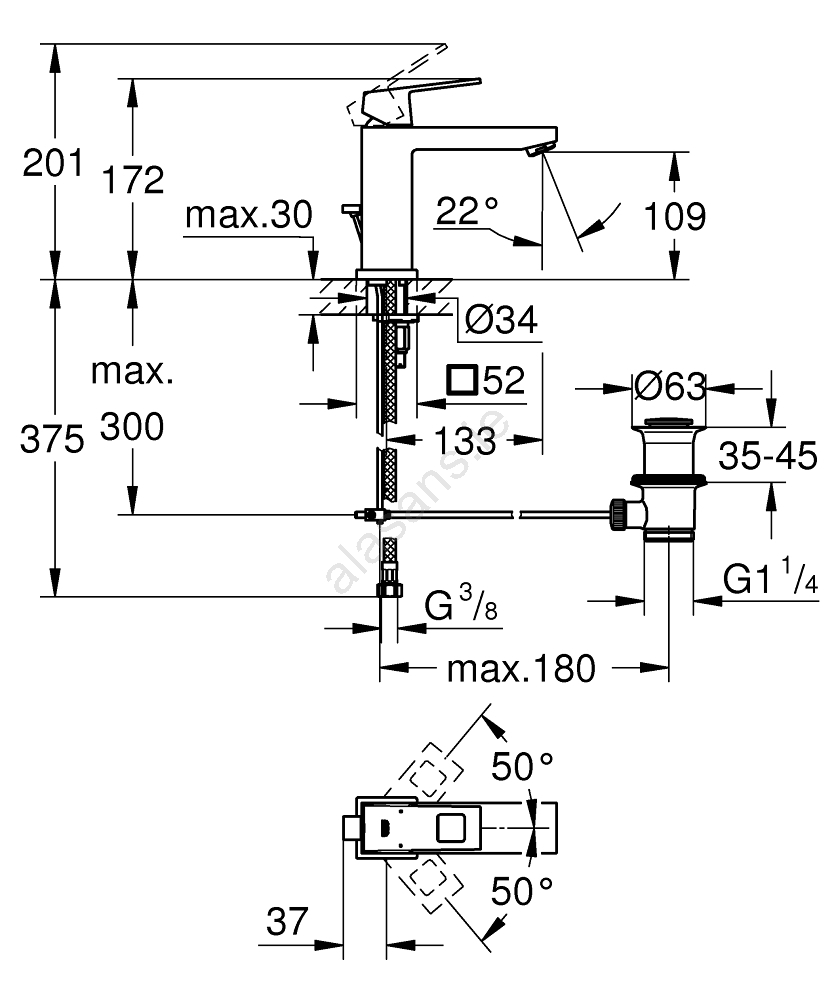• Overall height 172 mm and spout reach 133 mm provide comfortable clearance for washing.
