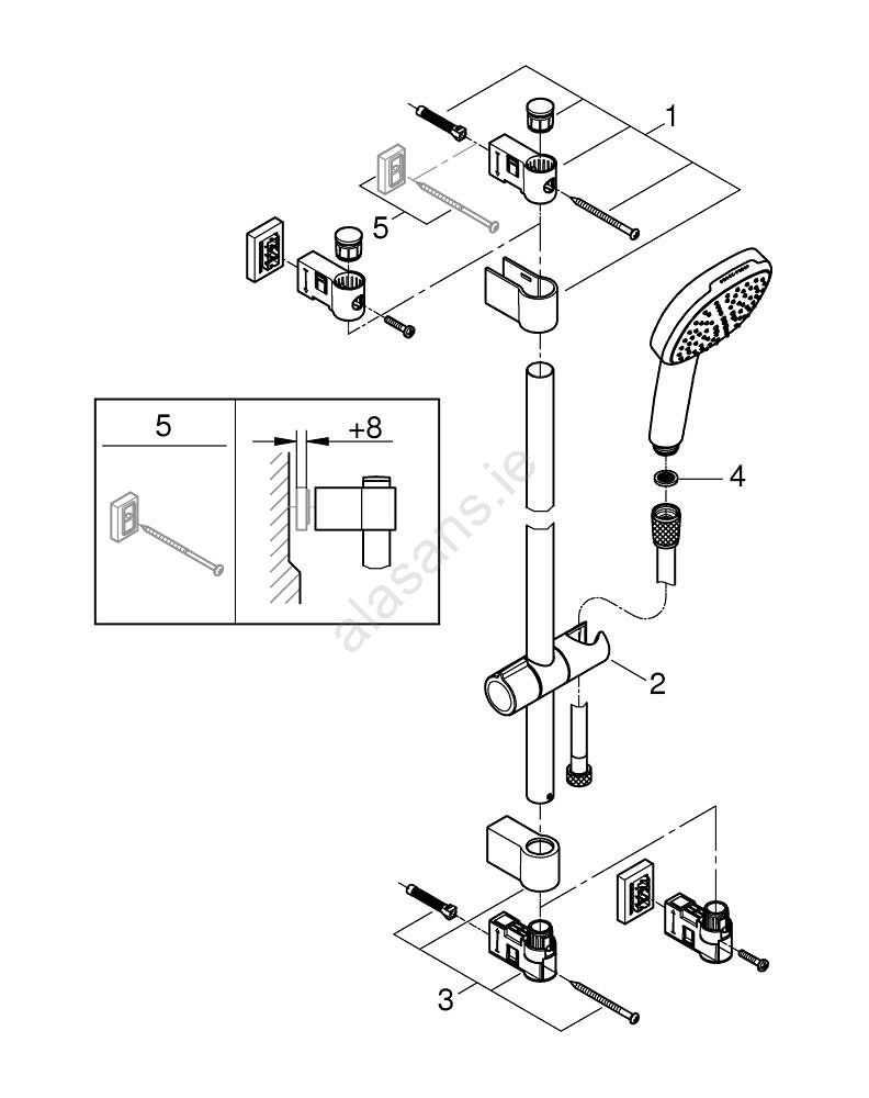 • GROHE FastFixation system with adjustable top bracket enables installation into existing mounting holes without the need to drill new ones.
