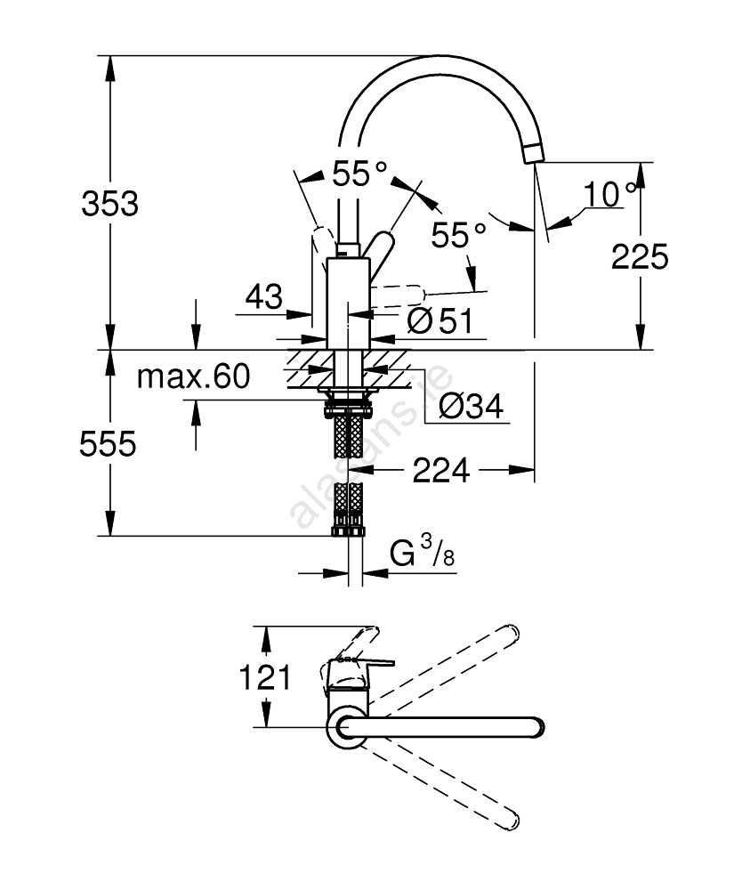 • Swiveling tubular spout with built-in stop and selectable swivel angle of 0° or 150° for flexible use.