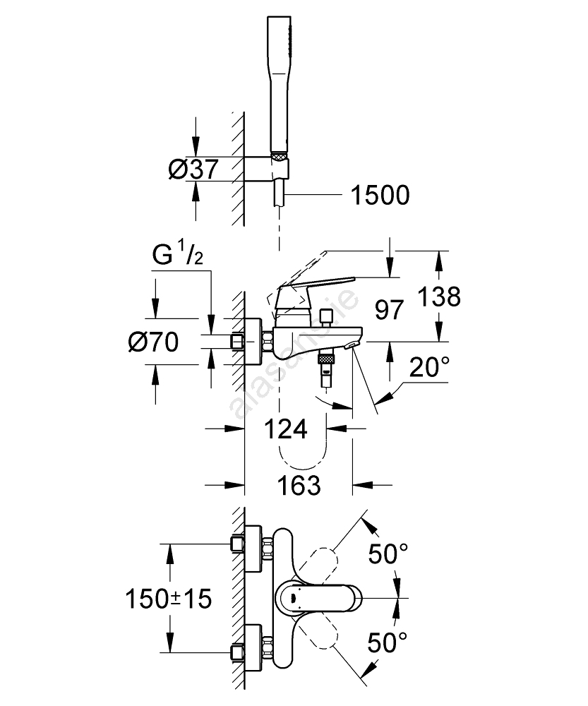 • Wall-mounted single-lever bath mixer for easy installation.