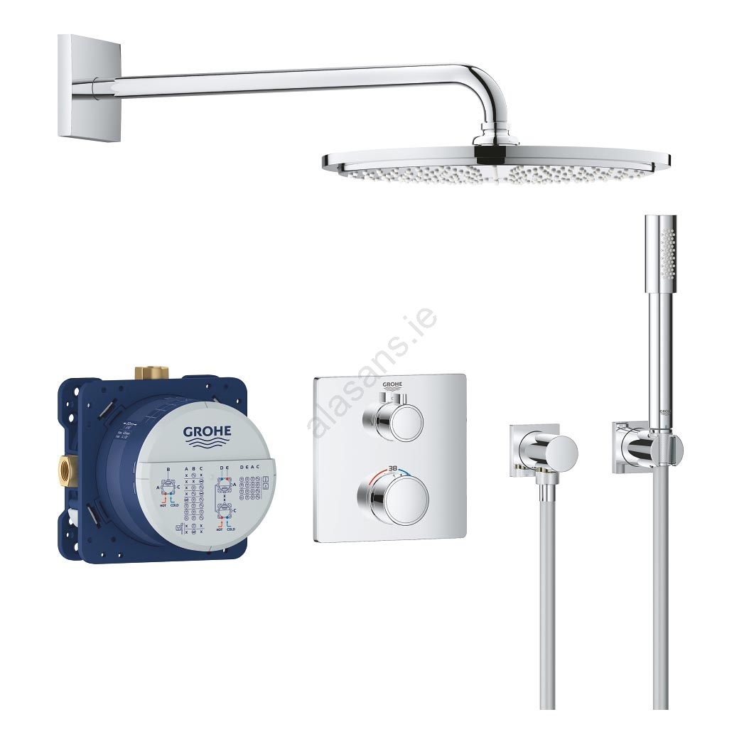 • Includes a Grohtherm thermostatic concealed mixer with Aquadimmer for easy switching between the overhead and hand shower.