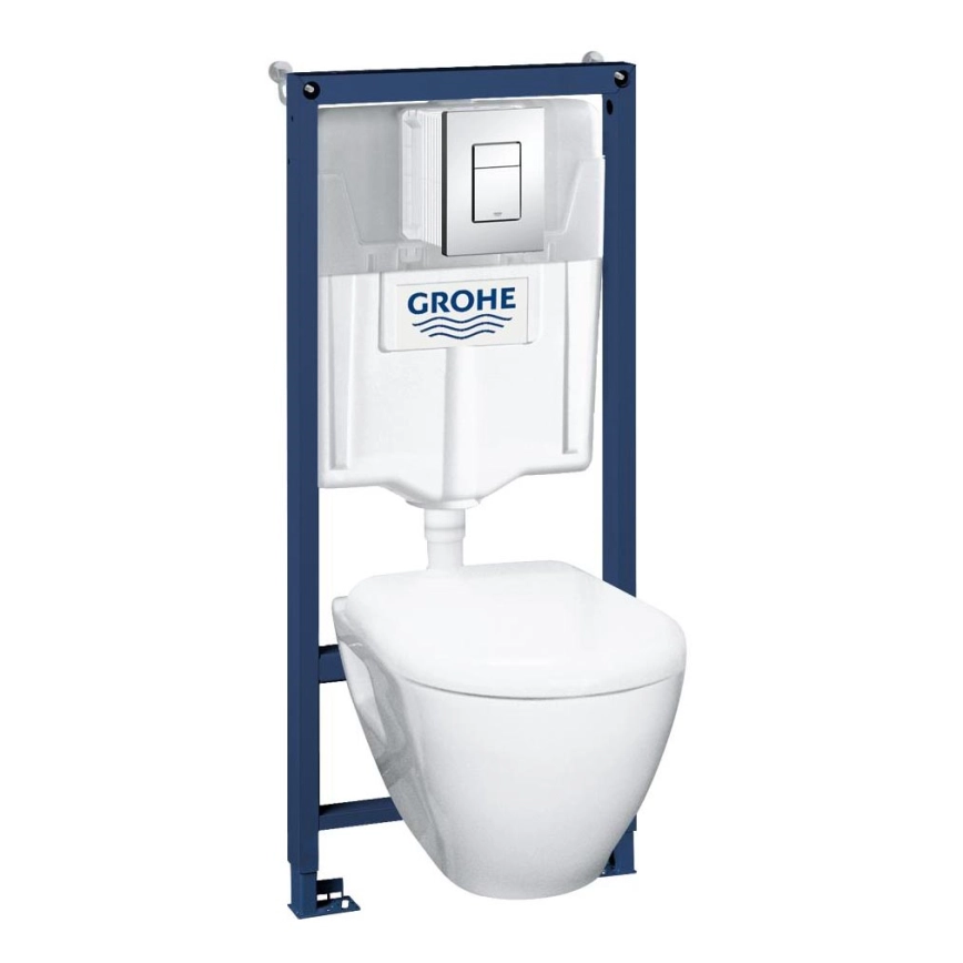 • Complete 4-in-1 set for installing a wall-hung toilet, including a flush cistern, steel carrier frame, ceramic bowl and flush plate.