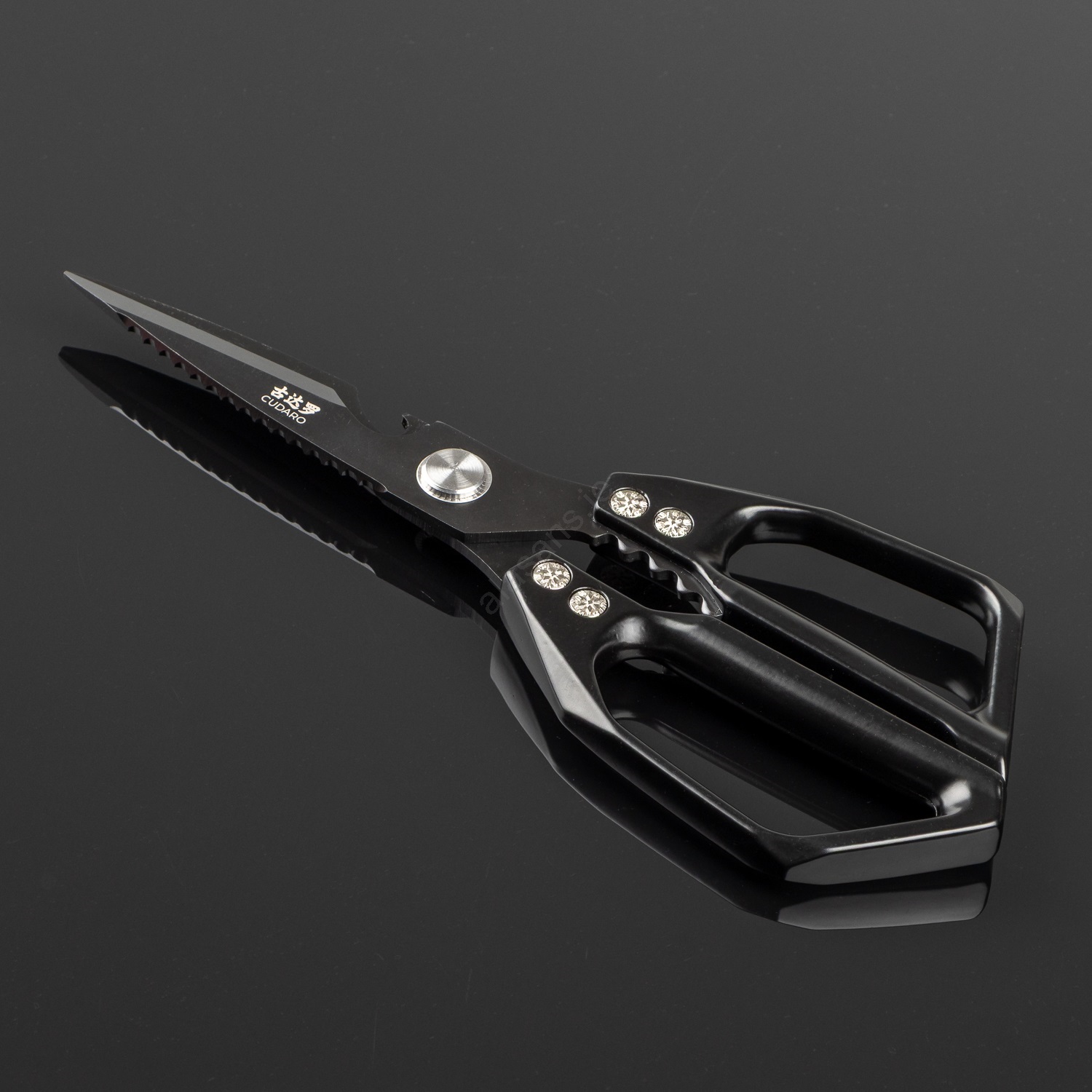 • Poultry shears made from durable 3Cr13 stainless steel and finished with a black titanium coating.
