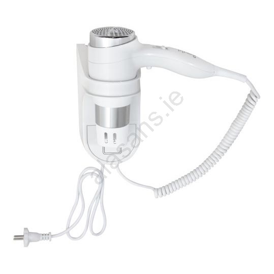 • Elegant white hairdryer with wall-mounted holder for space-saving.