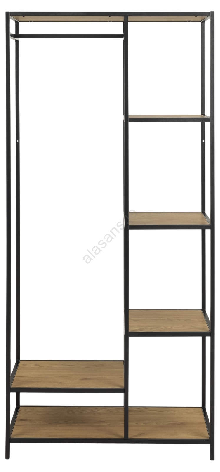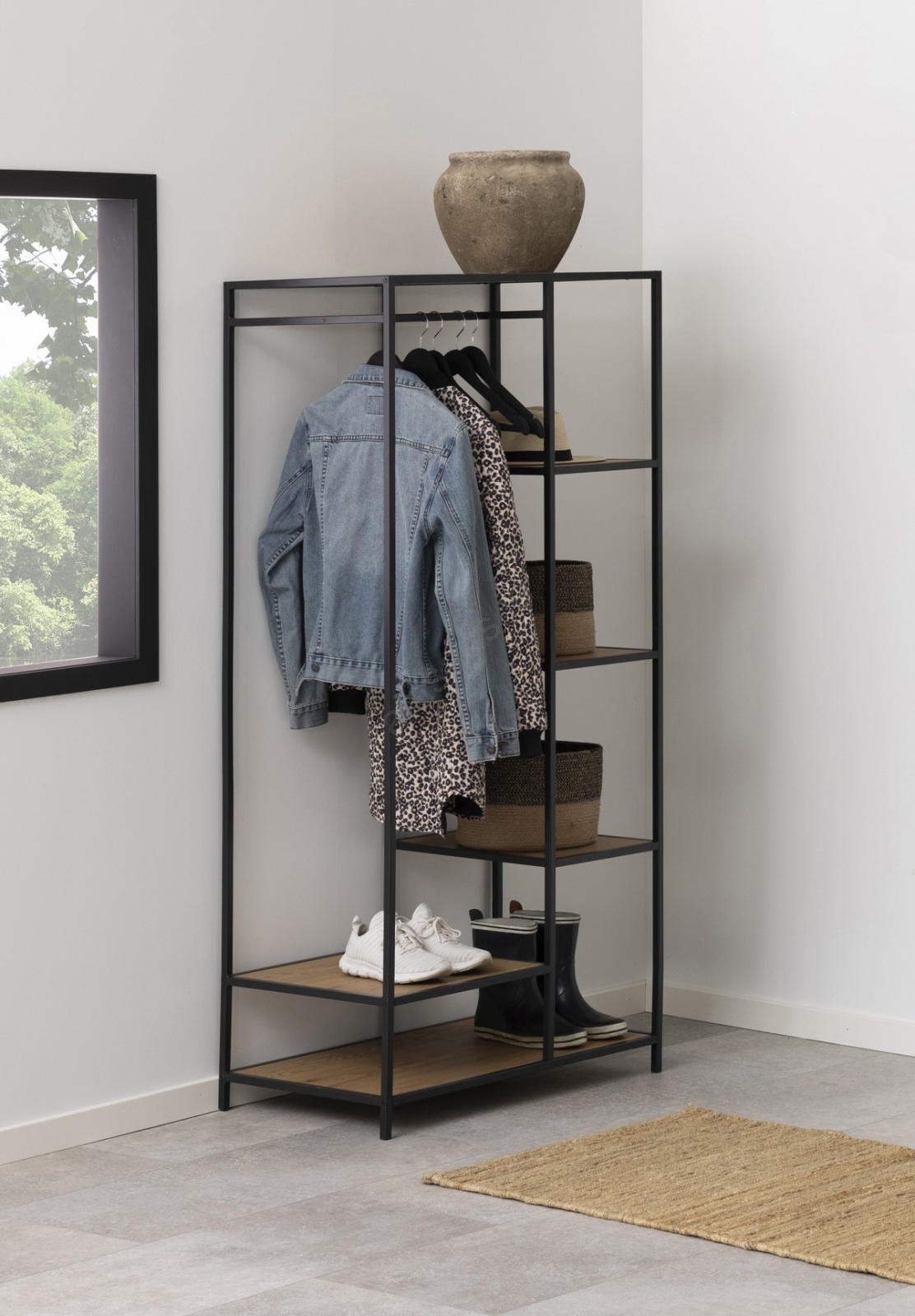 • Matte black, coarse powder-coated steel frame, 5 shelves and a matte craft-textured base with a clothing rail.