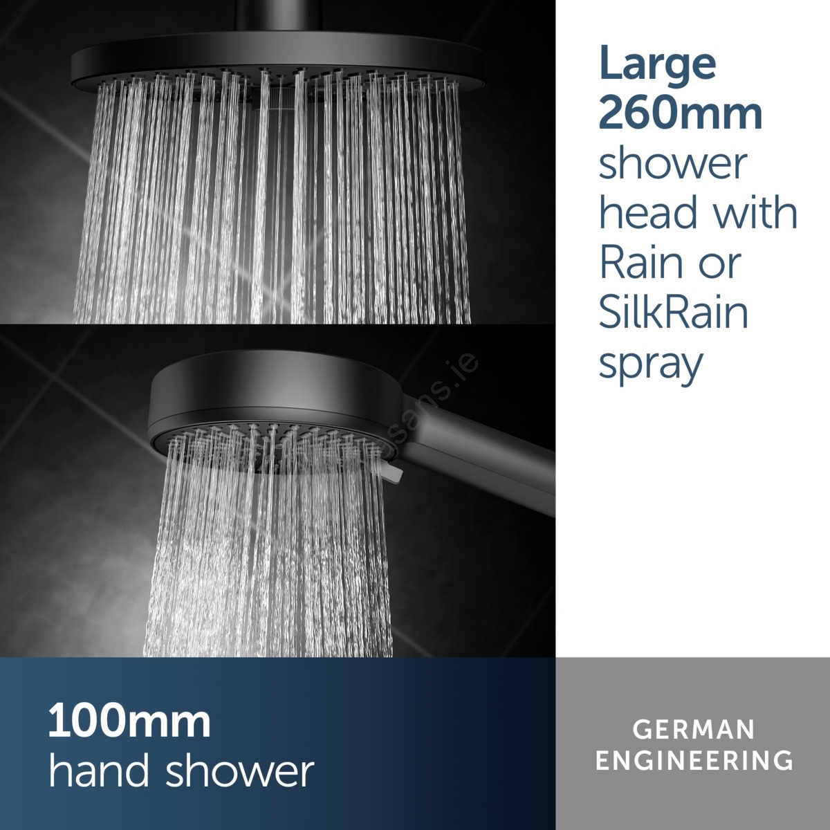 • The 260 mm overhead shower delivers two spray patterns (SilkRain and Rain), selectable via a central knob.